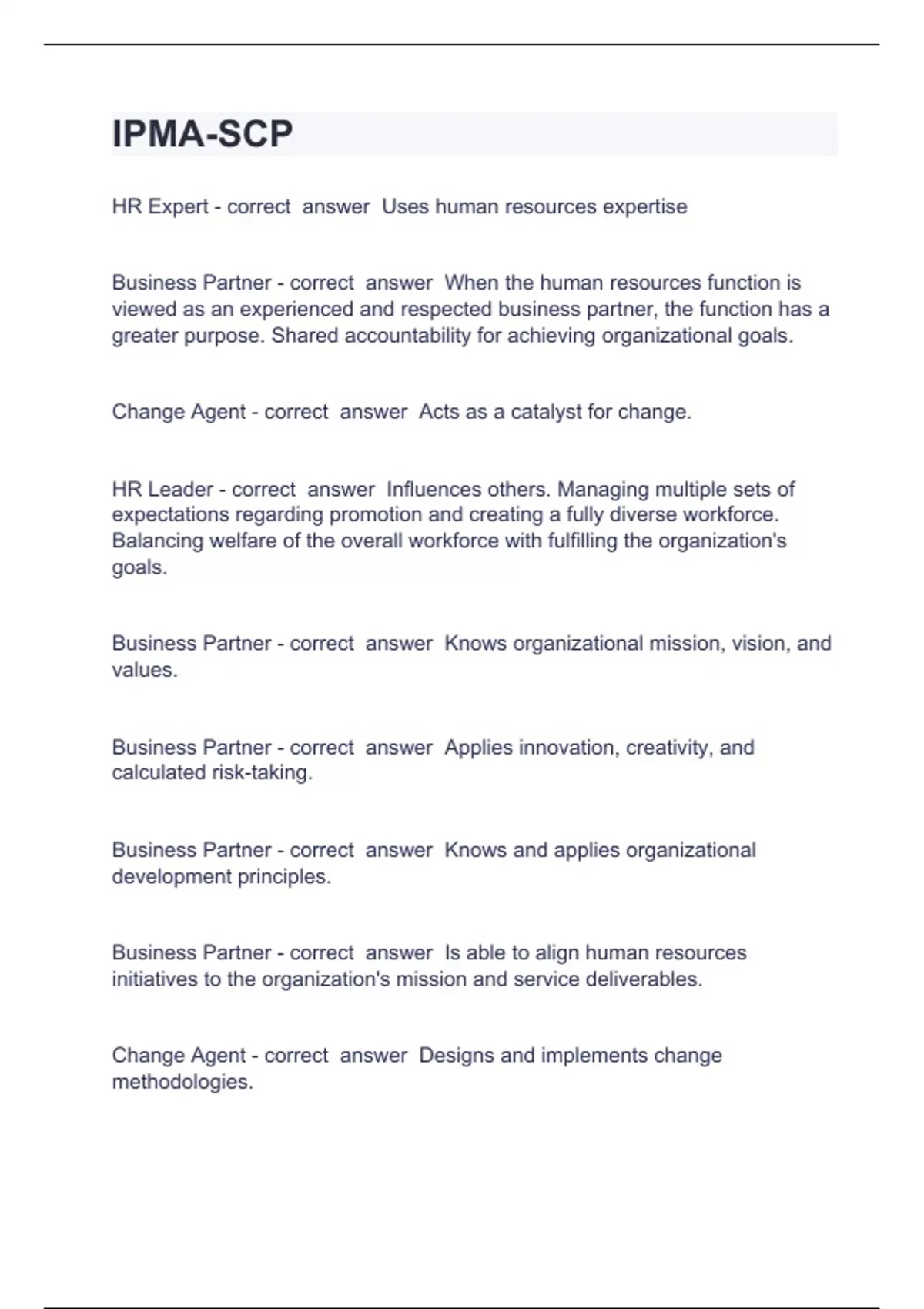 IPMA IPMA-SCP Chamberlain College Nursing - Question and answers 2024 IPMA-SCP HR Expert - correct answer Uses human resources expertise Business Partner - correct answer When the human resources function is viewed as an experienced and respected business partner, the function has a greater purpose. Shared accountability for achieving organizational goals. Change Agent - correct answer Acts as a catalyst for change. HR Leader - correct answer Influences others. Managing multiple sets of expectations regarding promotion and creating a fully diverse workforce. Balancing welfare of the overall workforce with fulfilling the organization's goals. Business Partner - correct answer Knows organizational mission, vision, and values. Business Partner - correct answer Applies innovation, creativity, and calculated risk-taking. Business Partner - correct answer Knows and applies organizational development principles. Business Partner - correct answer Is able to align human resources initiatives to the or