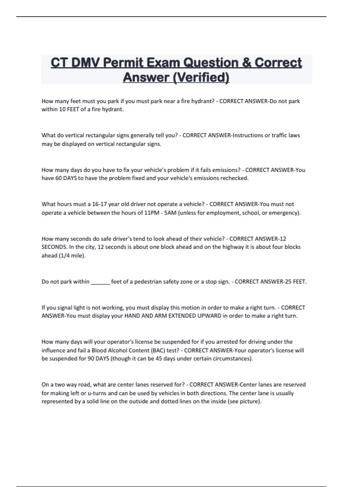 CT DMV Permit Exam Question & Correct Answer (Verified) How many feet must you park if you must park near a fire hydrant? - CORRECT ANSWER-Do not park within 10 FEET of a fire hydrant. What do vertical rectangular signs generally tell you? - CORRECT ANSWER-Instructions or traffic laws may be displayed on vertical rectangular signs. How many days do you have to fix your vehicle's problem if it fails emissions? - CORRECT ANSWER-You have 60 DAYS to have the problem fixed and your vehicle's emissions rechecked.