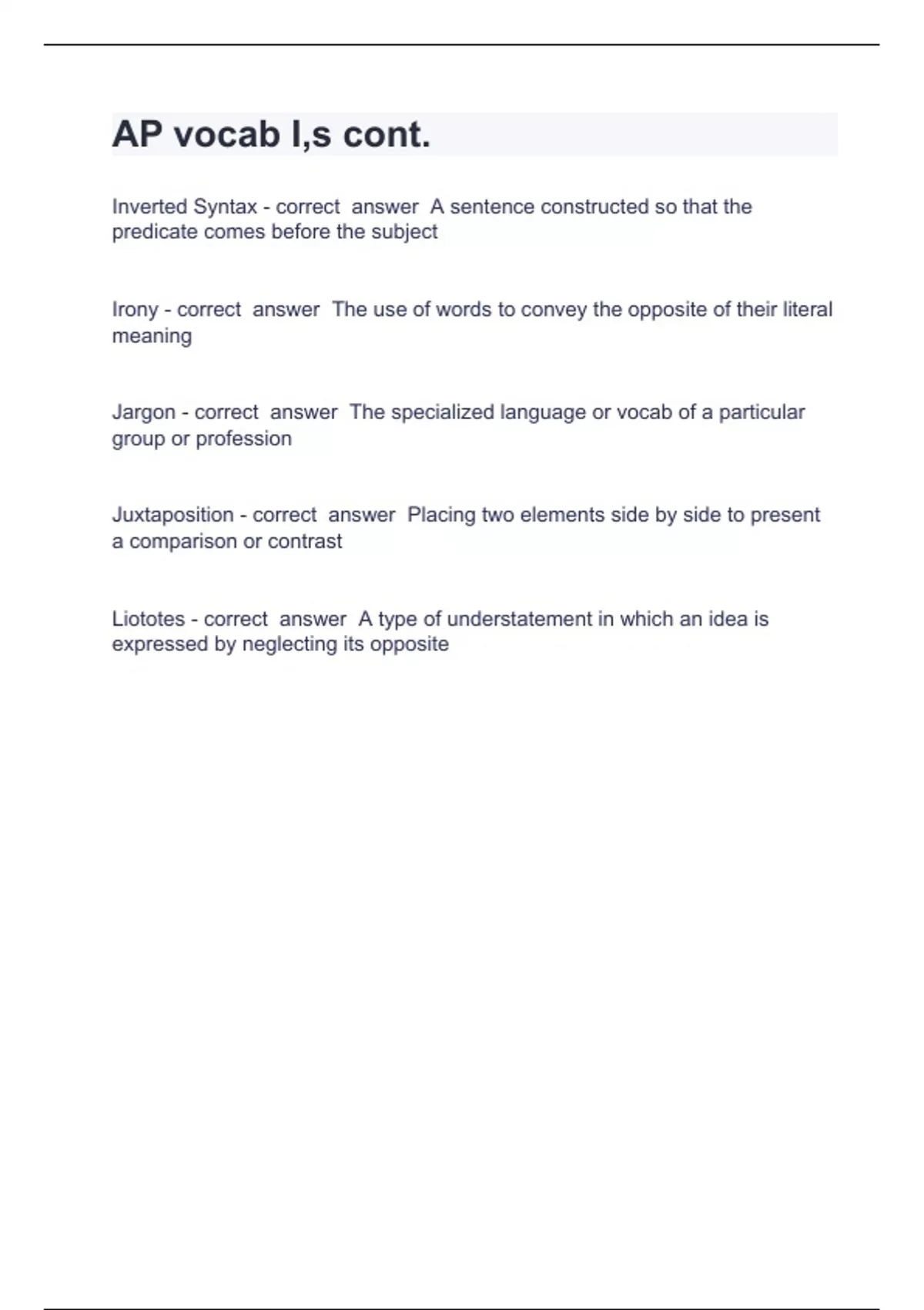 AP vocab I IPMA-SCP Chamberlain College Nursing -Question and answers 100% correct 2024AP vocab I,s cont. Inverted Syntax - correct answer A sentence constructed so that the predicate comes before the subject Irony - correct answer The use of words to convey the opposite of their literal meaning Jargon - correct answer The specialized language or vocab of a particular group or profession Juxtaposition - correct answer Placing two elements side by side to present a comparison or contrast Liototes - correct answer A type of understatement in which an idea is expressed by ne
