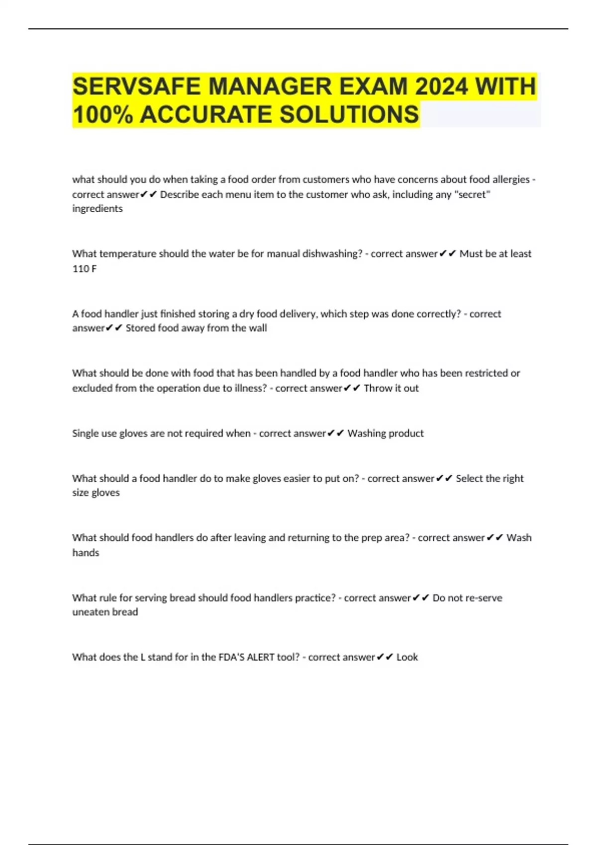SERVSAFE MANAGER EXAM 2024 WITH 100% ACCURATE SOLUTIONS what should you do when taking a food order from customers who have concerns about food allergies - correct answer Describe each menu item to the customer who ask, including any "secret" ingredients What temperature should the water be for manual dishwashing? - correct answer Must be at least 110 F A food handler just finished storing a dry food delivery, which step was done correctly? - correct answer Stored food away from the wall What should be done with food that has been handled by a food handler who has been restricted or excluded from the operation due to illness? - correct answer Throw it out Single use gloves are not required when - correct answer Washing product What should a food handler do to make gloves easier to put on? - correct answer Select the right size gloves What should food handlers do after leaving and returning to the prep area? - correct answer Wash hand