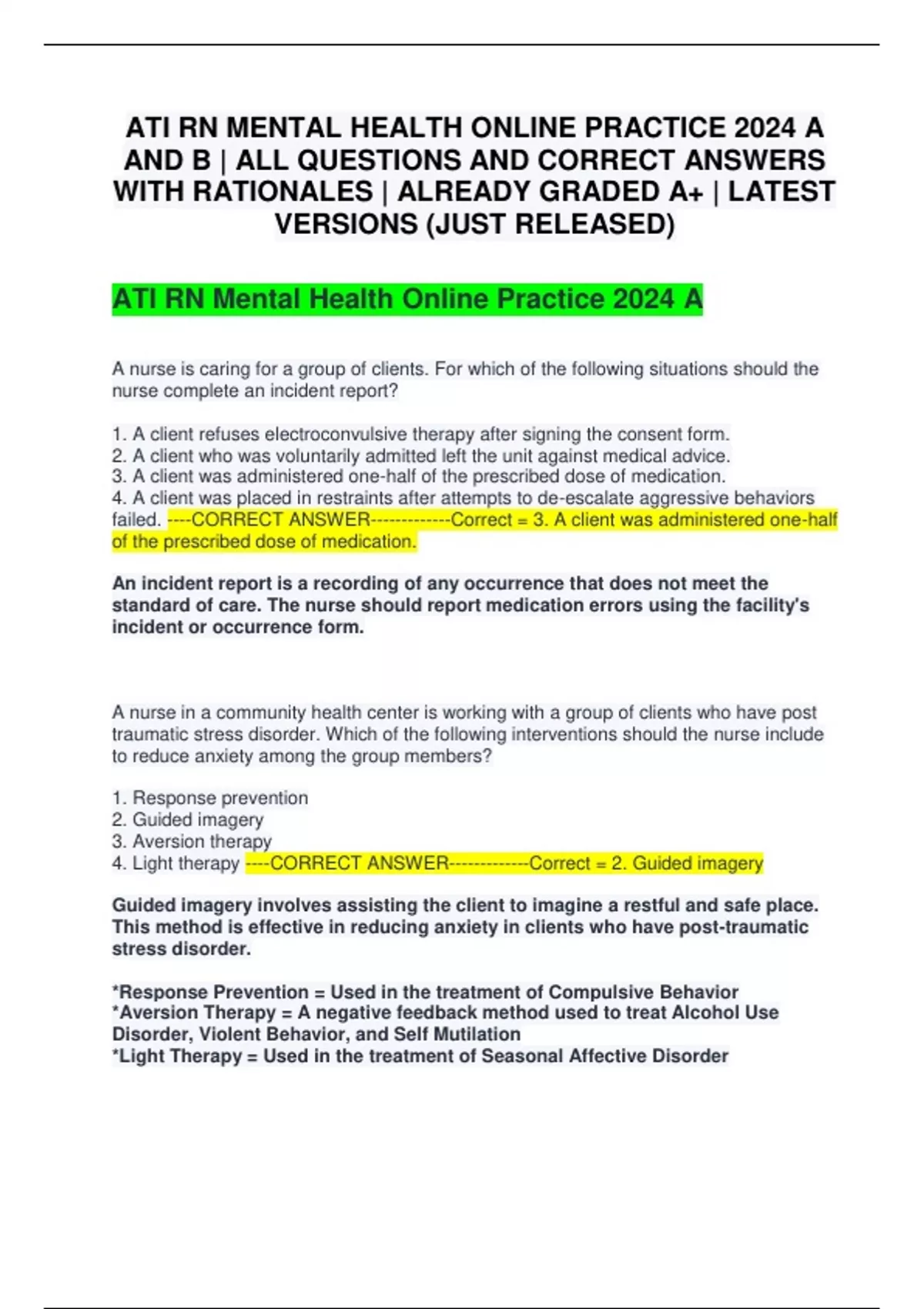 ATI RN MENTAL HEALTH ONLINE PRACTICE 2024 A AND B | ALL QUESTIONS AND CORRECT ANSWERS WITH RATIONALES | ALREADY GRADED A+ | LATEST VERSIONS (JUST RELEASED)