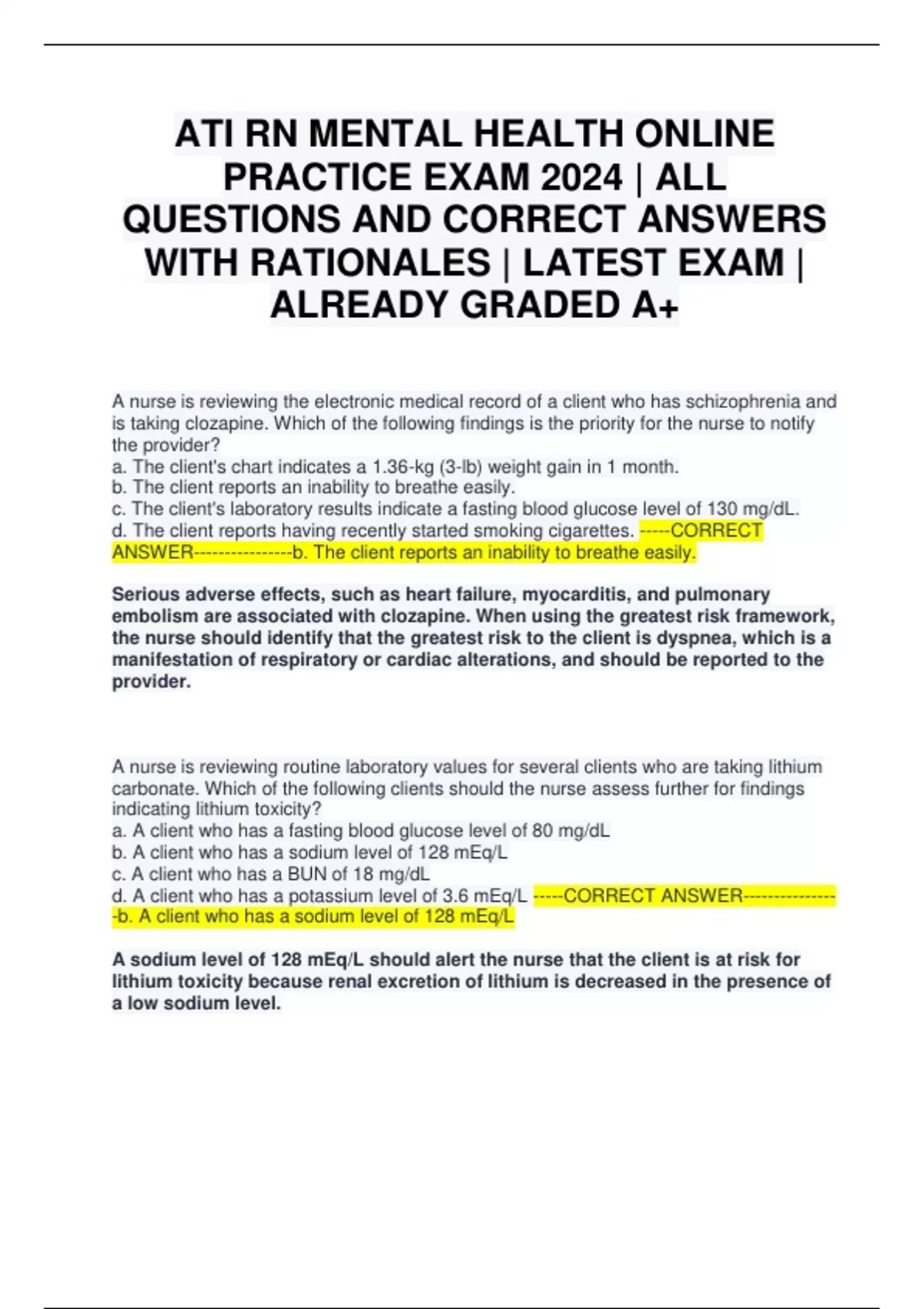 ATI RN MENTAL HEALTH ONLINE PRACTICE EXAM 2024 | ALL QUESTIONS AND CORRECT ANSWERS WITH RATIONALES | LATEST EXAM | ALREADY GRADED A+