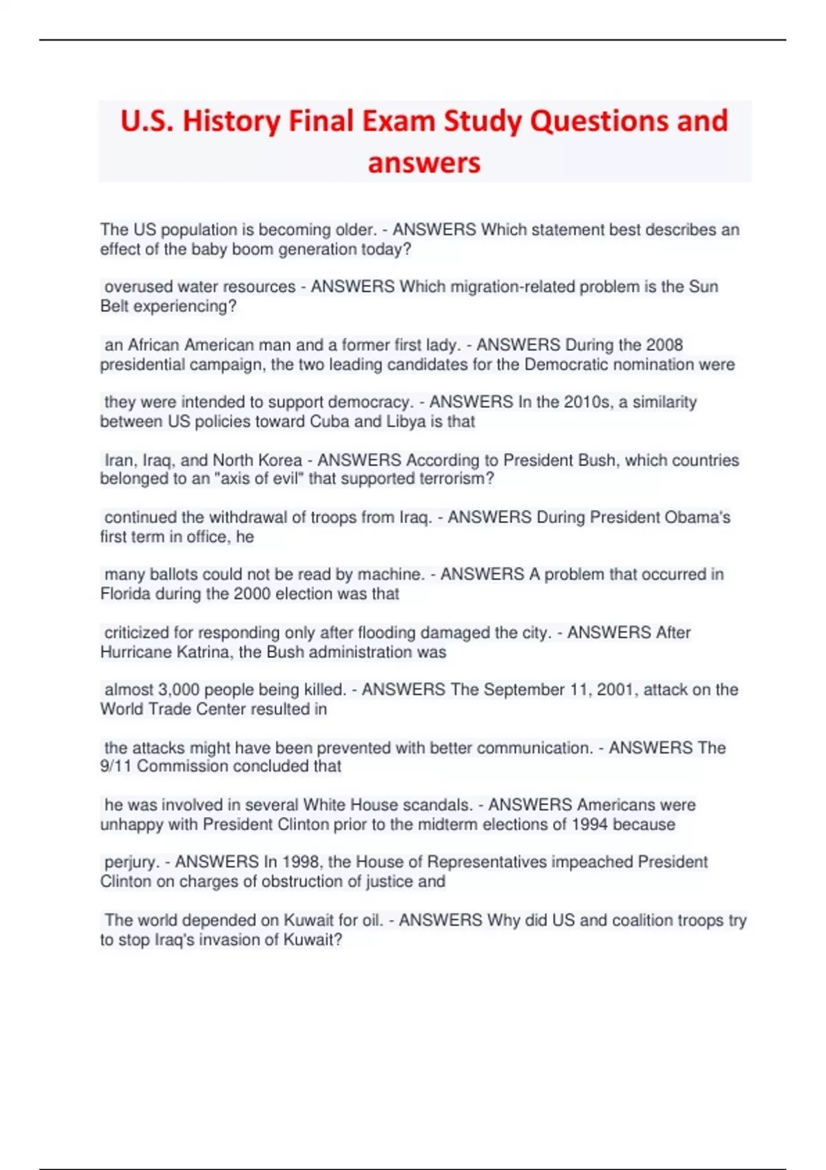 U.S. History Final Exam Study Questions and answers The US population is becoming older. - ANSWERS Which statement best describes an effect of the baby boom generation today? overused water resources - ANSWERS Which migration-related problem is the Sun Belt experiencing? an African American man and a former first lady. - ANSWERS During the 2008 presidential campaign, the two leading candidates for the Democratic nomination were they were intended to support democracy. - ANSWERS In the 2010s, a similarity between US policies toward Cuba and Libya is that Iran, Iraq, and North Korea - ANSWERS According to President Bush, which countries belonged to an "axis of evil" that supported terrorism? continued the withdrawal of troops from Iraq. - ANSWERS During President Obama's first term in office, he many ballots could not be read by machine. - ANSWERS A problem that occurred in Florida during the 2000 election was that criticized for responding only after flooding damaged the city. - ANSWERS After Hurricane Katrina, the Bush administration was almost 3,000 people being killed. - ANSWERS The September 11, 2001, attack on the World Trade Center resulted in the attacks might have been prevented with better communication. - ANSWERS The 9/11 Commission concluded that he was involved in several White House scandals. - ANSWERS Americans were unhappy with President Clinton prior to the midterm elections of 1994 because perjury. - ANSWERS In 1998, the House of Representatives impeached President Clinton on charges of obstruction of justice and The world depended on Kuwait for oil. - ANSWERS Why did US and coalition troops try to stop Iraq's invasion of Kuwait? were killed during a conflict. - ANSWERS When President Clinton sent US peacekeeping troops to Somalia in 1993, US troops Communist hardliners. - ANSWERS The attempted coup against the Soviet government in 1991 was led by the deaths of many protestors. - ANSWERS Multiple Choice In 1989, pro-democracy demonstrations in China led to They disapproved of President Carter's approach to handling issues. - ANSWERS Why did many Americans seek a change in the election of 1980? stop the spread of Communism. - ANSWERS One major reason for US involvement in Latin America in the 1980s was to women feel worthless when they deny themselves freedom of expression. - ANSWERS In The Feminine Mystique, the author argued that the women's rights movement. - ANSWERS The Supreme Court ruling in Roe v. Wade was seen as a victory for inflation and unemployment rates were high. - ANSWERS In the economic climate of the 1970s, freeing Americans taken hostage by Iran - ANSWERS What foreign-policy goal did President Carter fail to accomplish? visit China while in office. - ANSWERS In 1972, Nixon became the first US president to angered many American voters. - ANSWERS President Ford's method of moving beyond the Watergate scandal abolished the old immigration quotas. - ANSWERS The Immigration Act of 1965 the need to escape civil war and poverty. - ANSWERS One push factor that increased immigration from Central America and the Caribbean to the United States was base decisions on previous decisions - ANSWERS What is a conservative Supreme Court most likely to do? they have the right to the presence of an attorney. - ANSWERS Miranda rights require police to tell accused people that the assassination of President Kennedy - ANSWERS Which event occurred in 1963 and caused the country to experience a major transition? The amount of low-quality housing declined. - ANSWERS How did the Great Society programs affect housing in the United States? a turn away from liberal reforms. - ANSWERS Nixon's presidential win in 1968 marked It required the president to inform Congress within forty-eight hours of the details of any troop commitment. - ANSWERS How did the War Powers Resolution of 1973 affect the power of the US president? began to question both the war and the fairness of the draft. - ANSWERS After twenty years of US involvement in Vietnam, many Americans agreed with the counterculture and He sent more military equipment, more money, and thousands of advisers. - ANSWERS When the Viet Cong seemed to be winning the war in South Vietnam in 1961, how did President Kennedy react? a promise by the United States not to invade Cuba again. - ANSWERS The secret agreement that ended the Cuban Missile Crisi