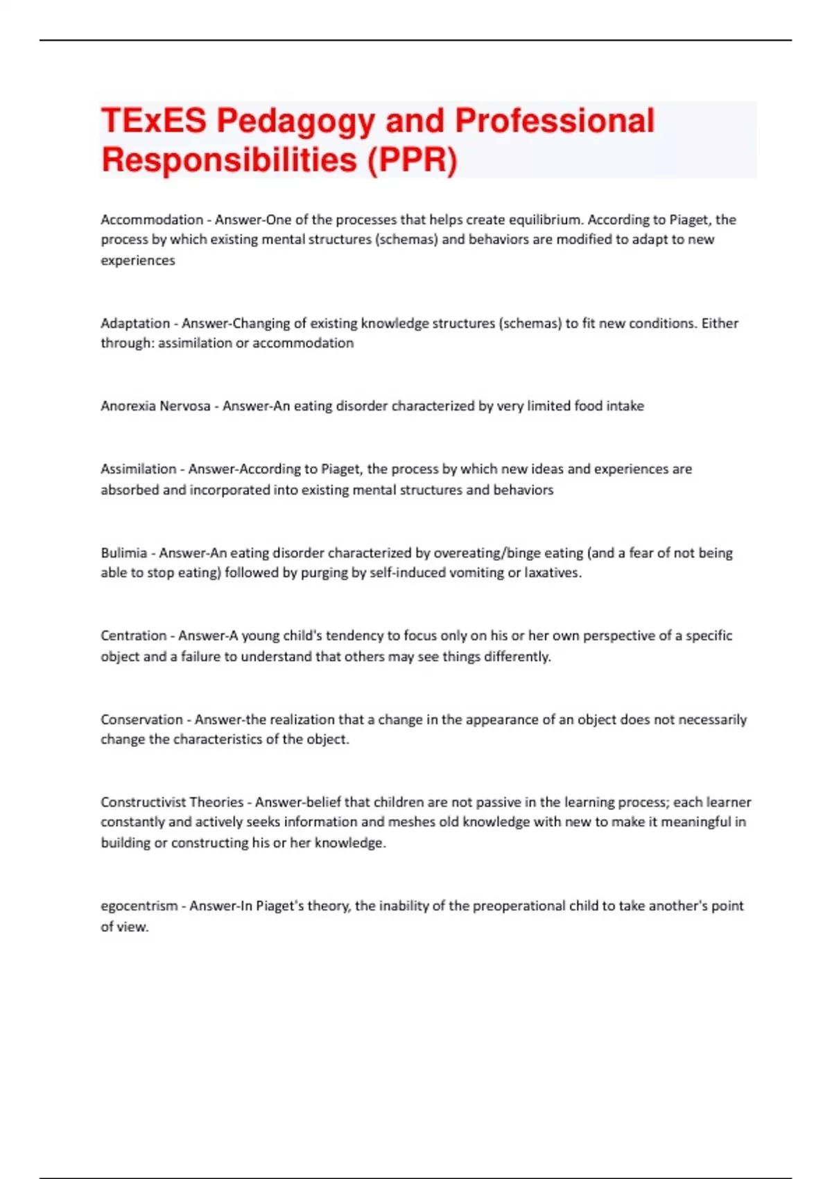 Accommodation - Answer-One of the processes that helps create equilibrium. According to Piaget, the process by which existing mental structures (schemas) and behaviors are modified to adapt to new experiences Adaptation - Answer-Changing of existing knowledge structures (schemas) to fit new conditions. Either through: assimilation or accommodation Anorexia Nervosa - Answer-An eating disorder characterized by very limited food intake Assimilation - Answer-According to Piaget, the process by which new ideas and experiences are absorbed and incorporated into existing mental structures and behaviors Bulimia - Answer-An eating disorder characterized by overeating/binge eating (and a fear of not being able to stop eating) followed by purging by self-induced vomiting or laxatives. Centration - Answer-A young child's tendency to focus only on his or her own perspective of a specific object and a failure to understand that others may see things differently. Conservation - Answer-the realization that a change in the appearance of an object does not necessarily change the characteristics of the object. Constructivist Theories - Answer-belief that children are not passive in the learning process; each learner constantly and actively seeks information and meshes old knowledge with new to make it meaningful in building or constructing his or her knowledge. egocentrism - Answer-In Piaget's theory, the inability of the preoperational child to take another's point of ibration - Answer-the constant innate search for a balance between what we already know and a new activity, skill, or social experience Imaginary Audience - Answer-Adolescents' belief that they are the focus of everyone else's attention and concern. maturation - Answer-internally determined to change metacognitive ability - Answer-the ability to think about one's own cognitive thinking processes and to use this process to facilitate learning