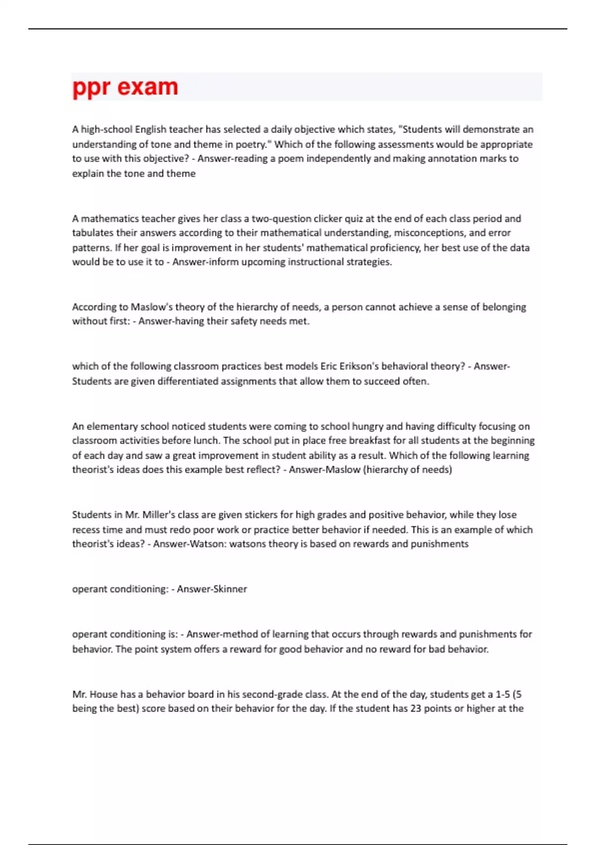 A high-school English teacher has selected a daily objective which states, "Students will demonstrate an understanding of tone and theme in poetry." Which of the following assessments would be appropriate to use with this objective? - Answer-reading a poem independently and making annotation marks to explain the tone and theme A mathematics teacher gives her class a two-question clicker quiz at the end of each class period and tabulates their answers according to their mathematical understanding, misconceptions, and error patterns. If her goal is improvement in her students' mathematical proficiency, her best use of the data would be to use it to - Answer-inform upcoming instructional strategies. According to Maslow's theory of the hierarchy of needs, a person cannot achieve a sense of belonging without first: - Answer-having their safety needs met. which of the following classroom practices best models Eric Erikson's behavioral theory? - AnswerStudents are given differentiated assignments that allow them to succeed often. An elementary school noticed students were coming to school hungry and having difficulty focusing on classroom activities before lunch. The school put in place free breakfast for all students at the beginning of each day and saw a great improvement in student ability as a result. Which of the following learning theorist's ideas does this example best reflect? - Answer-Maslow (hierarchy of needs) Students in Mr. Miller's class are given stickers for high grades and positive behavior, while they lose recess time and must redo poor work or practice better behavior if needed. This is an example of which theorist's ideas? - Answer-Watson: watsons theory is based on rewards and punishments operant conditioning: - Answer-Skinner operant conditioning is: - Answer-method of learning that occurs through rewards and punishments for behavior. The point system offers a reward for good behavior and no reward for bad behavior. Mr. House has a behavior board in his second-grade class. At the end of the day, students get a 1-5 (5 being the best) score based on their behavior for the day. If the student has 23 points or higher at theend of the week, they will earn a reward; if they have less than 23 points, they will not. Which of the following theories does this technique reflect? - Answer-operant conditioning Stages of development ERICKSON: - Answer-people must pass through eight life stages in order to fulfill their own potential. Failure to complete any phase will hinder their ability to continue growth with success. interactionist - Answer-Assumes that actions can be explained by analyzing the factors around the child. They think that growth occurs during the interaction between the child and society, and by studying all the factors, it is possible to understand and conceivably alter behavior by altering the various factors. interventionist - Answer-Assumes people need external stimulation to guide behavior. Opposite of noninterventionists. non-interventionist - Answer-Assumes people are naturally striving to be good and they want to improve, and thus the teacher does not need to intervene regarding behavior issues because the child is trying to improve. believe that adults need to allow children as much room as they need so they can grow and improve naturally on their own. Hierarchy of needs: - Answer-Learning theory developed by Maslow - In order for people to meet their full potential they must meet a series of needs. A teacher wants to require students to purchase a novel for an assigned reading. Which of the following is the most appropriate source for the teacher to check whether requiring the purchase is allowable? - Answer-Texas Education Code A student qualifies for special education services, and the student needs an Individualized Education Program (IEP). Which THREE of the following people must be involved in developing the plan? - AnswerSped teacher-school admin- gen ed teacher Horizontal Teaming - Answer-comprised of members from different content areas: but they are all on the same grade levelVertical Teaming - Answer-vertical team is comprised of members from different grade levels who meet to share ideas and fine tune their curriculum.