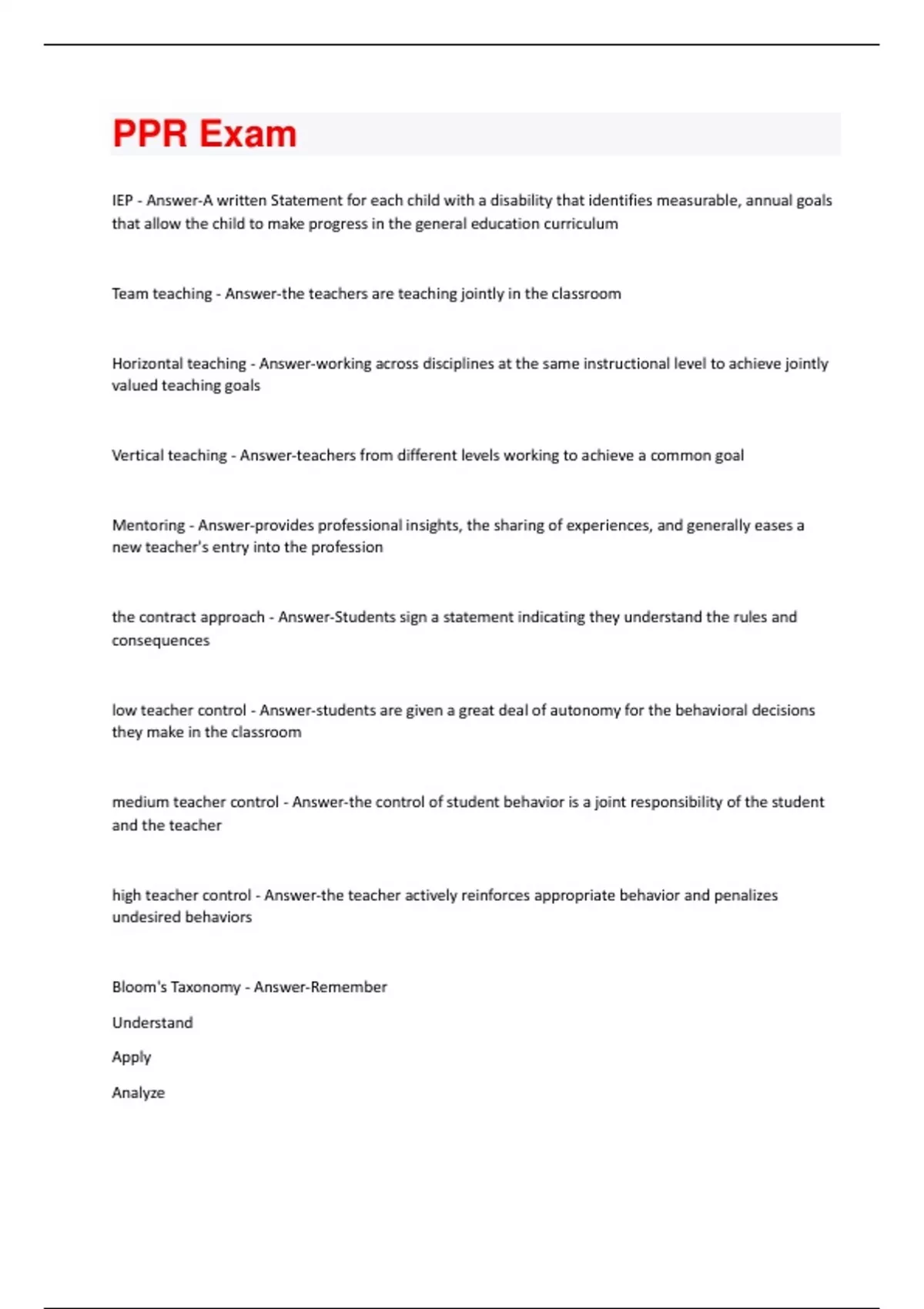 IEP - Answer-A written Statement for each child with a disability that identifies measurable, annual goals that allow the child to make progress in the general education curriculum Team teaching - Answer-the teachers are teaching jointly in the classroom Horizontal teaching - Answer-working across disciplines at the same instructional level to achieve jointly valued teaching goals Vertical teaching - Answer-teachers from different levels working to achieve a common goal Mentoring - Answer-provides professional insights, the sharing of experiences, and generally eases a new teacher's entry into the profession the contract approach - Answer-Students sign a statement indicating they understand the rules and consequences low teacher control - Answer-students are given a great deal of autonomy for the behavioral decisions they make in the classroom medium teacher control - Answer-the control of student behavior is a joint responsibility of the student and the teacher high teacher control - Answer-the teacher actively reinforces appropriate behavior and penalizes undesired behaviors Bloom's Taxonomy - Answer-Remember Understand Apply AnalyzeEvaluate Create Remembering - Answer-Retrieve objective knowledge