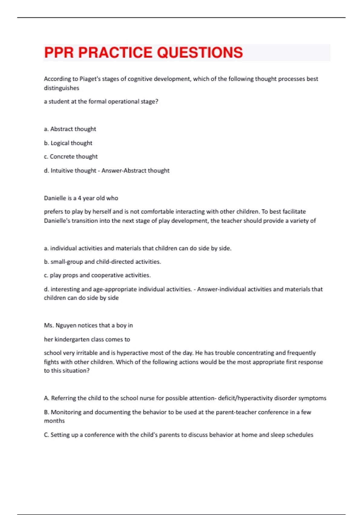 According to Piaget's stages of cognitive development, which of the following thought processes best distinguishes a student at the formal operational stage? a. Abstract thought b. Logical thought c. Concrete thought d. Intuitive thought - Answer-Abstract thought Danielle is a 4 year old who prefers to play by herself and is not comfortable interacting with other children. To best facilitate Danielle's transition into the next stage of play development, the teacher should provide a variety of a. individual activities and materials that children can do side by side. b. small-group and child-directed activities. c. play props and cooperative activities. d. interesting and age-appropriate individual activities. - Answer-individual activities and materials that children can do side by side Ms. Nguyen notices that a boy in her kindergarten class comes to school very irritable and is hyperactive most of the day. He has trouble concentrating and frequently fights with other children. Which of the following actions would be the most appropriate first response to this situation? A. Referring the child to the school nurse for possible attention- deficit/hyperactivity disorder symptoms B. Monitoring and documenting the behavior to be used at the parent-teacher conference in a few months C. Setting up a conference with the child's parents to discuss behavior at home and sleep schedulesD. Collaborating with an administrator to develop an intervention plan to address behavior - AnswerSetting up a conference with the child's parents to discuss behavior at home and sleep schedules To best ensure that all students in a fourth-grade inclusion classroom receive quality instruction, which of the following should lesson plans always include? A. Individual assignments for each student and planned time for whole-class reteaching B. Activities at varying difficulty levels to allow for students to make self-directed choices C. Extra time for reteaching and needs-based modifications of student activities D. Blocks of time for small-group instruction for students with learning disabilities - Answer-Extra time for reteaching and needs-based modifications of student activities 5. A first-grade teacher has readers who are below grade level, each at a different level. In planning individualized instruction, which of the following is the best first step for the teacher to take? A. Providing an assessment to identify students' reading strengths and weaknesses B. Incorporating daily drills for students to practice reading skills C. Having students pulled out of the classroom for small-group reading instruction D. Developing students' oral language and writing skills - Answer-Providing an assessment to identify students' reading strengths and weaknesses 6. An English-language learner (ELL) who is at an advanced-high level of language proficiency is preparing a report summarizing a science experiment. The most appropriate expectation for the teacher to have of the ELL's report is that it will include A. illustrations of concepts that the student struggles with communicating in writing. B. a reliance on teacher-provided sentence stems to complete the report. C. writing that is correct in content but below grade level in syntax and grammar. D. grade-level content information communicated with few language-related errors. - Answer-grade-level content information communicated with few language-related errors.Fifth-grade students have just completed a social studies unit in which they explored pioneers' everyday life during the westward expansion. Which of the following student activities would show the highest level of critical thinking? A. Creating a time line of important events during westward expansion B. Completing a multiple-choice assessment about pioneers during westward expansion C. Writing a journal entry from the perspective of a pioneer during westward expansion D. Drawing a picture showing a pioneer during westward expansion - Answer-Writing a journal entry from the perspective of a pioneer during westward expansion