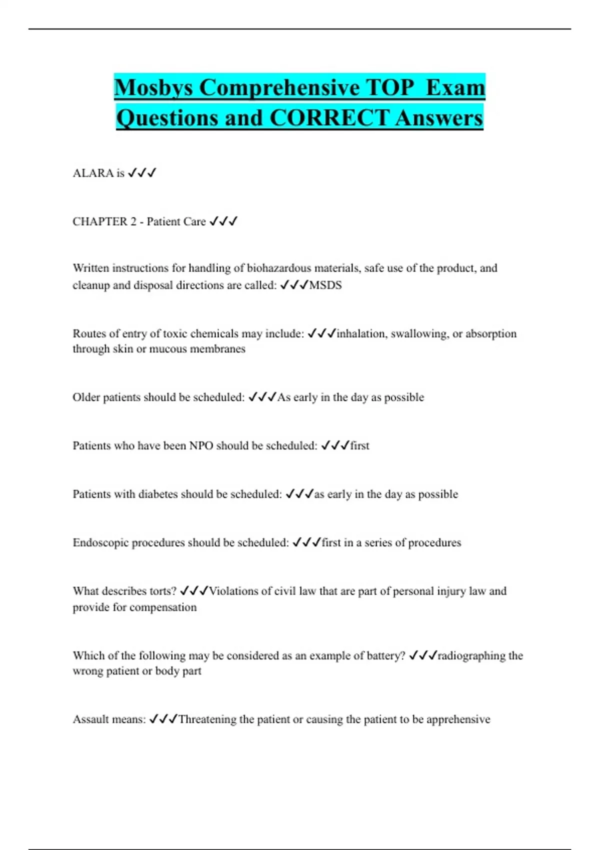 ALARA is CHAPTER 2 - Patient Care Written instructions for handling of biohazardous materials, safe use of the product, and cleanup and disposal directions are called: MSDS Routes of entry of toxic chemicals may include: inhalation, swallowing, or absorption through skin or mucous membranes Older patients should be scheduled: As early in the day as possible Patients who have been NPO should be scheduled: first Patients with diabetes should be scheduled: as early in the day as possible