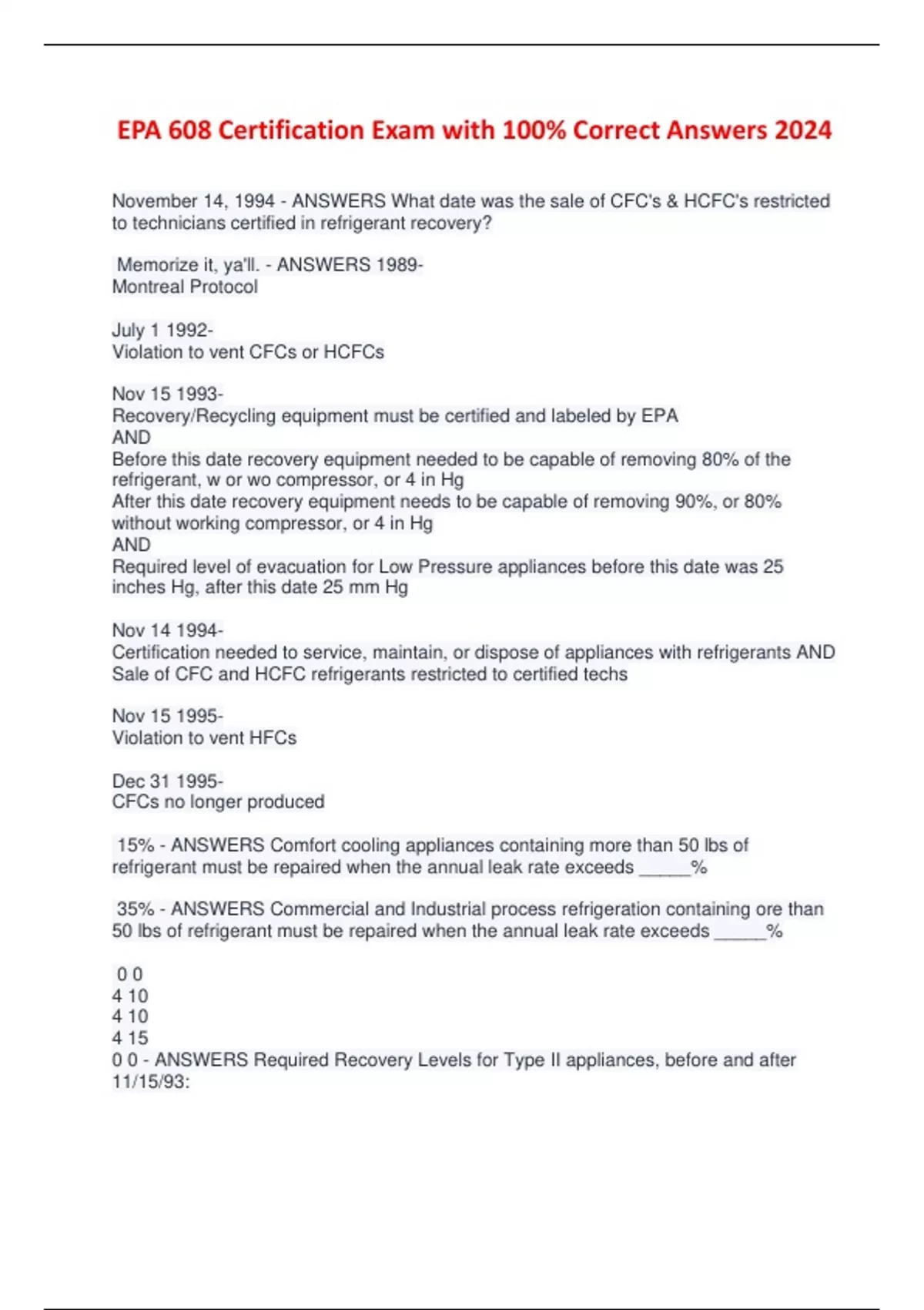 EPA 608 Certification Exam with 100% Correct Answers 2024 November 14, 1994 - ANSWERS What date was the sale of CFC's & HCFC's restricted to technicians certified in refrigerant recovery? Memorize it, ya'll. - ANSWERS 1989- Montreal Protocol July 1 1992- Violation to vent CFCs or HCFCs Nov 15 1993- Recovery/Recycling equipment must be certified and labeled by EPA AND Before this date recovery equipment needed to be capable of removing 80% of the refrigerant, w or wo compressor, or 4 in Hg After this date recovery equipment needs to be capable of removing 90%, or 80% without working compressor, or 4 in Hg AND Required level of evacuation for Low Pressure appliances before this date was 25 inches Hg, after this date 25 mm Hg Nov 14 1994- Certification needed to service, maintain, or dispose of appliances with refrigerants AND Sale of CFC and HCFC refrigerants restricted to certified techs Nov 15 1995- Violation to vent HFCs Dec 31 1995- CFCs no longer produced 15% - ANSWERS Comfort cooling appliances containing more than 50 lbs of refrigerant must be repaired when the annual leak rate exceeds _____% 35% - ANSWERS Commercial and Industrial process refrigeration containing ore than 50 lbs of refrigerant must be repaired when the annual leak rate exceeds _____% 0 0 4 10 4 10 4 15 0 0 - ANSWERS Required Recovery Levels for Type II appliances, before and after 11/15/93: HCFC22 less than 200 lbs = B4-0 After-0 HCFC22 more than 200 lbs= B4-4 After-10 NonHCFC22 less than 200 lbs= B4-4 After 10 NonHCFC22 more than 200 lbs= B4 4 After 15 Very high pressure appliances= B4-0 After-0 Recover all refrigerants. - ANSWERS Section 608 of the Federal Clean Air Act requires technicians to what? The earth's stratosphere. - ANSWERS The objective of the Clean Air Act is to protect what? HydroFlouroCarbon's - ANSWERS HFC's ChloroFluoroCarbon's - ANSWERS CFC's Ozone Depletion Potential - ANSWERS ODP The Montreal Protocol. - ANSWERS Which international treaty agreement was the basis for Section 608? 1.Crop losses 2.Increases in eye diseases 3.Skin Cancer 4.Reduced marine life 5.Deforestation 6.Increased ground level ozone - ANSWERS Depletion of the ozone in the stratosphere is known to cause what 6 things? These atoms attack Ozone Molecules causing the formation of Chlorine Monoxide (CLO), after colliding with another Ozone Molecule, causes 2 Oxygen (O2) molecules to be made & leaving an atom of chlorine to act as "Free Agent" starting the process over until 100,000 molecules of Ozone are destroyed by just one atom of chloride. - ANSWERS What happens when CFC or HCFC molecules get in the stratosphere & free atoms of Chlorine are set free? November 15, 1993 - ANSWERS What date was recovery equipment required to be certified by a lab, & achieve higher evacuation levels, & have low loss fittings? November 14, 1994 - ANSWERS On what date was technician certification required? December 31, 1995 - ANSWERS What date were CFC's phased out of production? Persons who maintain, service, repair, or dispose of small appliances (containing 5 pounds of refrigerant (or less). - ANSWERS What is EPA 608 Type I certification? Persons who maintain, service, repair, or dispose of high and very high pressure appliances. Except small appliances and motor vehicle air conditioning systems. - ANSWERS What is EPA 608 Type II certification? Persons who maintain, service, repair, or dispose of low pressure appliances. - ANSWERS What is EPA 608 Type III certification? Persons who maintain, service, repair, or dispose of both low and high pressure equipment, as well as appliances. - ANSWERS What is EPA 608 Universal certification? HydroChloroFluoroCarbons - ANSWERS HCFC's Commonly known as HCFC's, they are a group of man-made compunds containing hydrogen, chlorine, fluorine, and carbon. - ANSWERS What are HydroChloroFluoroCarbons? 80% - ANSWERS A recovery cylinder must not be filled more than ___ % of it's capacity by weight? Up-right with proper DOT classification tags. - ANSWERS How should refrigerant cylinders be shipped