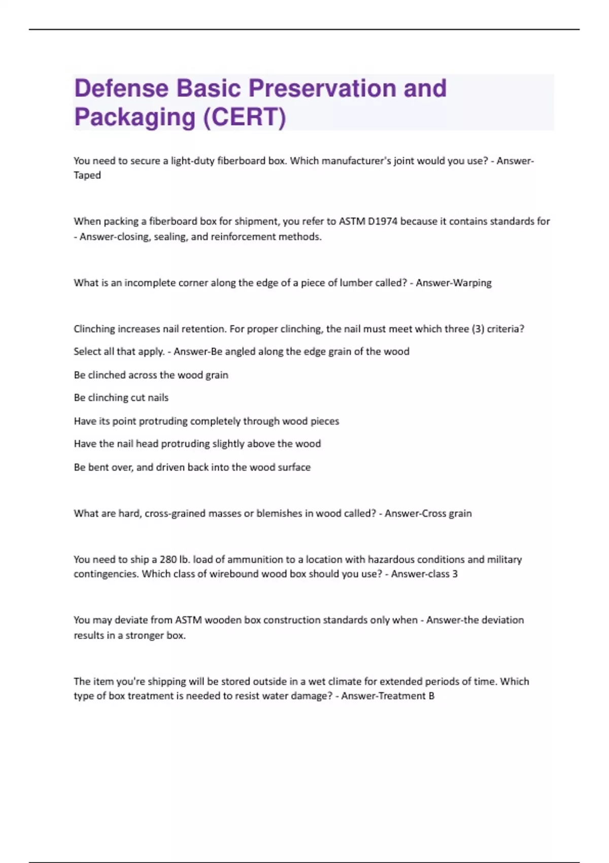 You need to secure a light-duty fiberboard box. Which manufacturer's joint would you use? - AnswerTaped When packing a fiberboard box for shipment, you refer to ASTM D1974 because it contains standards for - Answer-closing, sealing, and reinforcement methods. What is an incomplete corner along the edge of a piece of lumber called? - Answer-Warping Clinching increases nail retention. For proper clinching, the nail must meet which three (3) criteria? Select all that apply. - Answer-Be angled along the edge grain of the wood Be clinched across the wood grain Be clinching cut nails Have its point protruding completely through wood pieces Have the nail head protruding slightly above the wood Be bent over, and driven back into the wood surface What are hard, cross-grained masses or blemishes in wood called? - Answer-Cross grain You need to ship a 280 lb. load of ammunition to a location with hazardous conditions and military contingencies. Which class of wirebound wood box should you use? - Answer-class 3 You may deviate from ASTM wooden box construction standards only when - Answer-the deviation results in a stronger box. The item you're shipping will be stored outside in a wet climate for extended periods of time. Which type of box treatment is needed to resist water damage? - Answer-Treatment BYou need to build a crate for an item that weighs 2200 lbs. Which crate-building standard do you use? - Answer-astm d7478 Which type of crate requires you to drill holes for ventilation? - Answer-Lumber-sheathed You are building a crate for a tall item that weighs 10,000 pounds. Which crate-building standard do you use? - Answer-ASTM D7478 Which Fast-Pack is used for small electronic components like circuit boards? - AnswerWhich type of specialized container would you use to ship a set of large blueprints across the U.S.? - Answer-Mailing tube You built wooden blocking-and-bracing structures for an item but still need to add stability. What is the solution shown here? - Answer-Metal bracket This type of item is often blocked and braced, but may not need cushioning because it can withstand significant impact without damage. - Answer-Rugged Non-military carriers have all of these restrictions EXCEPT - Answer-size and weight limits. You have a package approved for non-military shipment. It weighs 55 pounds and has a combined length plus girth that is 98 inches. Can you ship it via standard USPS? - Answer-Yes, the weight and length plus girth are under the limit. You are shipping a large DoD container. What special tagging is required for global tracking? - AnswerMSL Which marking is NOT included on the outer container label? - Answer-Contract or purchase order numberYou need to expedite a critical shipment. What special marking uses a three-position alphanumeric code to complete the shipment? - Answer-Project Code Which of the following bonding methods secures the load to the pallet? - Answer-Method D: Tie-down straps Which publication contains the military standards for pallets and palletization? - Answer-MIL-STD-147 Which blocking and bracing method prevents an ISO container load from moving up and down? - Answer-Vertical You must load a side-opening ISO container with loaded pallets measuring 43½ x 51 inches long. What is the best way to determine what pallet unit number to use? - Answer-Refer to load drawings for a sideopening ISO container. When loading a palletized ISO container load, what is the general guideline? - Answer-Block and brace according to load requirements and applicable load drawings.