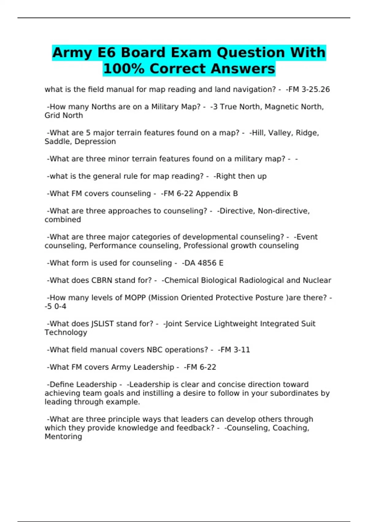 Army E6 Board Exam Question With 100% Correct Answers