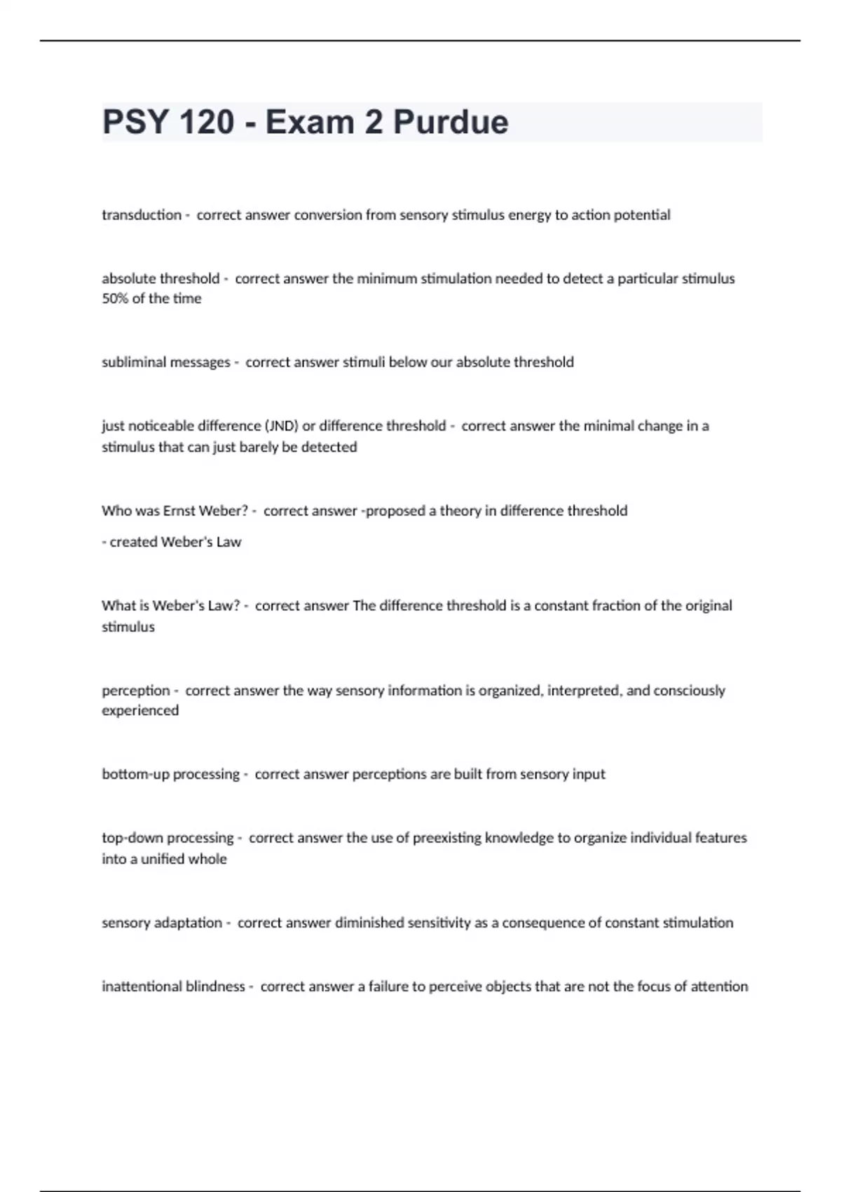 PSY 120 - Exam 2 Purdue Questions with complete solution 2024 PSY 120 - Exam 2 Purdue transduction - correct answer conversion from sensory stimulus energy to action potential absolute threshold - correct answer the minimum stimulation needed to detect a particular stimulus 50% of the time subliminal messages - correct answer stimuli below our absolute threshold just noticeable difference (JND) or difference threshold - correct answer the minimal change in a stimulus that can just barely be detected Who was Ernst Weber? - correct answer -proposed a theory in difference threshold - created Weber's Law What is Weber's Law? - correct answer The difference threshold is a constant fraction of the original stimulus perception - correct answer the way sensory information is organized, interpreted, and consciously experienced bottom-up processing - correct answer perceptions are built from sensory input