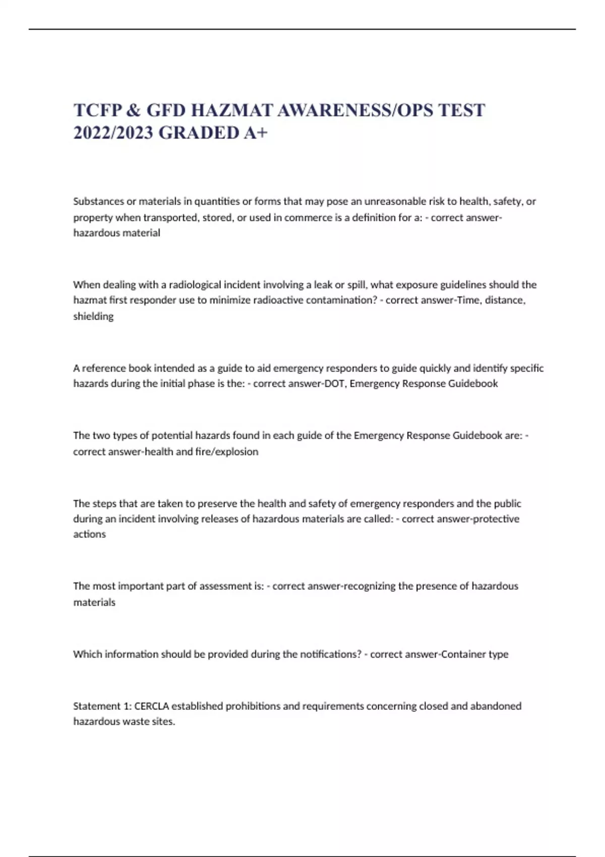 TCFP & GFD HAZMAT AWARENESS/OPS TEST 2022/2023 GRADED A+