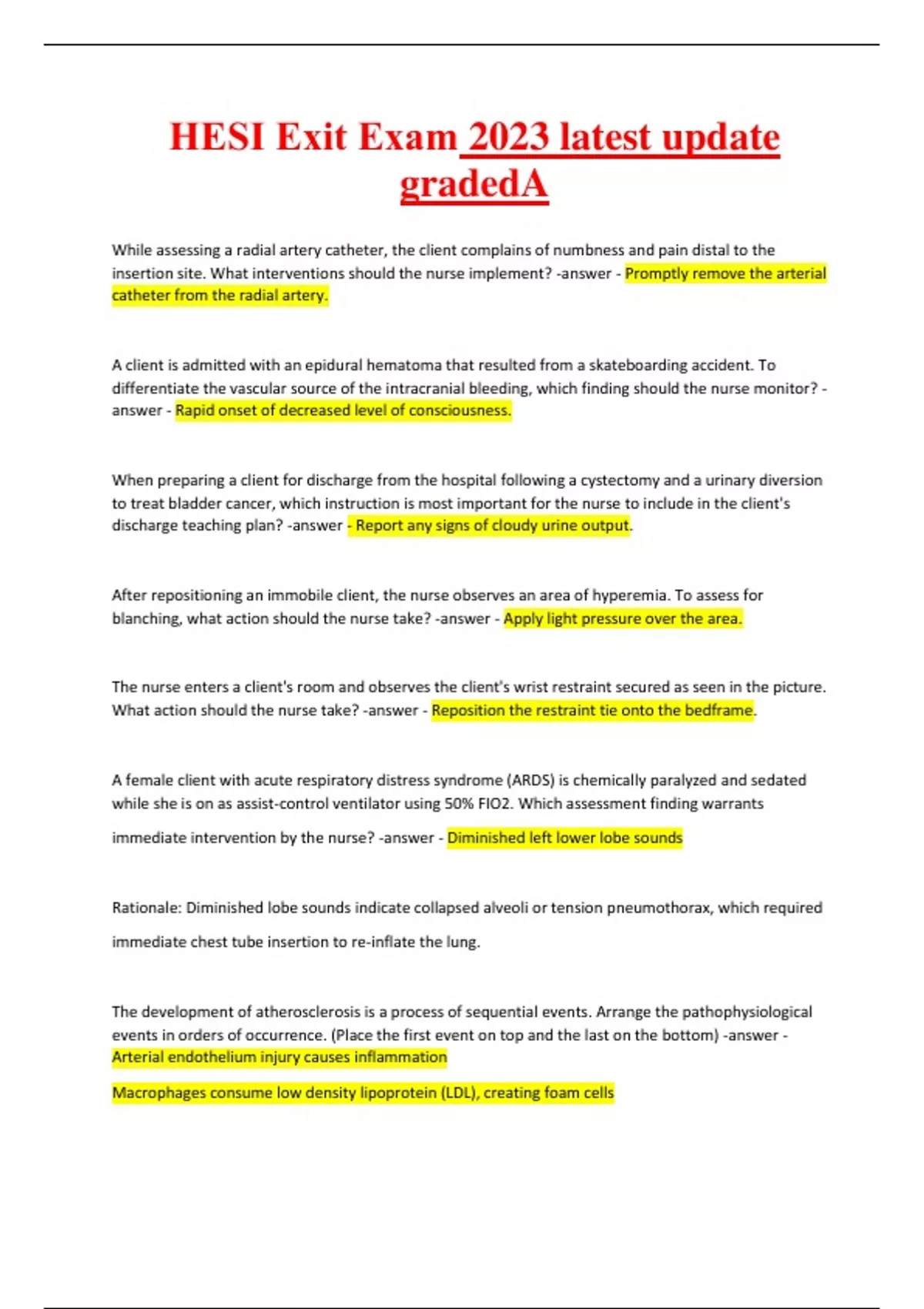 HESI Exit Exam 2023 latest update gradedA While assessing a radial artery catheter, the client complains of numbness and pain distal to the insertion site. What interventions should the nurse implement? -answer - Promptly remove the arterial catheter from the radial artery.