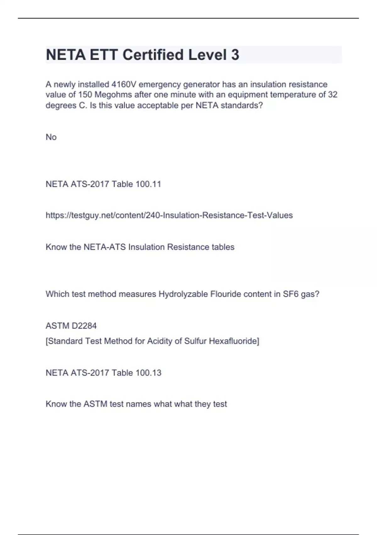 NETA ETT Certified Level 3 Study Guide Test 2024. A newly installed 4160V emergency generator has an insulation resistance value of 150 Megohms after one minute with an equipment temperature of 32 degrees C. Is this value acceptable per NETA standards? No NETA ATS-2017 Table 100.11 Know the NETA-ATS Insulation Resistance tables Which test method measures Hydrolyzable Flouride content in SF6 gas? ASTM D2284 [Standard Test Method for Acidity of Sulfur Hexafluoride] NETA ATS-2017 Table 100.13 Know the ASTM test names what what they test Brainpower Read More Previous Play Next Rewind 10 seconds Move forward 10 seconds Unmute 0:01 / 0:15 Full screen The operating speed of a protective relay is dependent on: * Spring Tension * Armature core air gap * Rate of flux built up