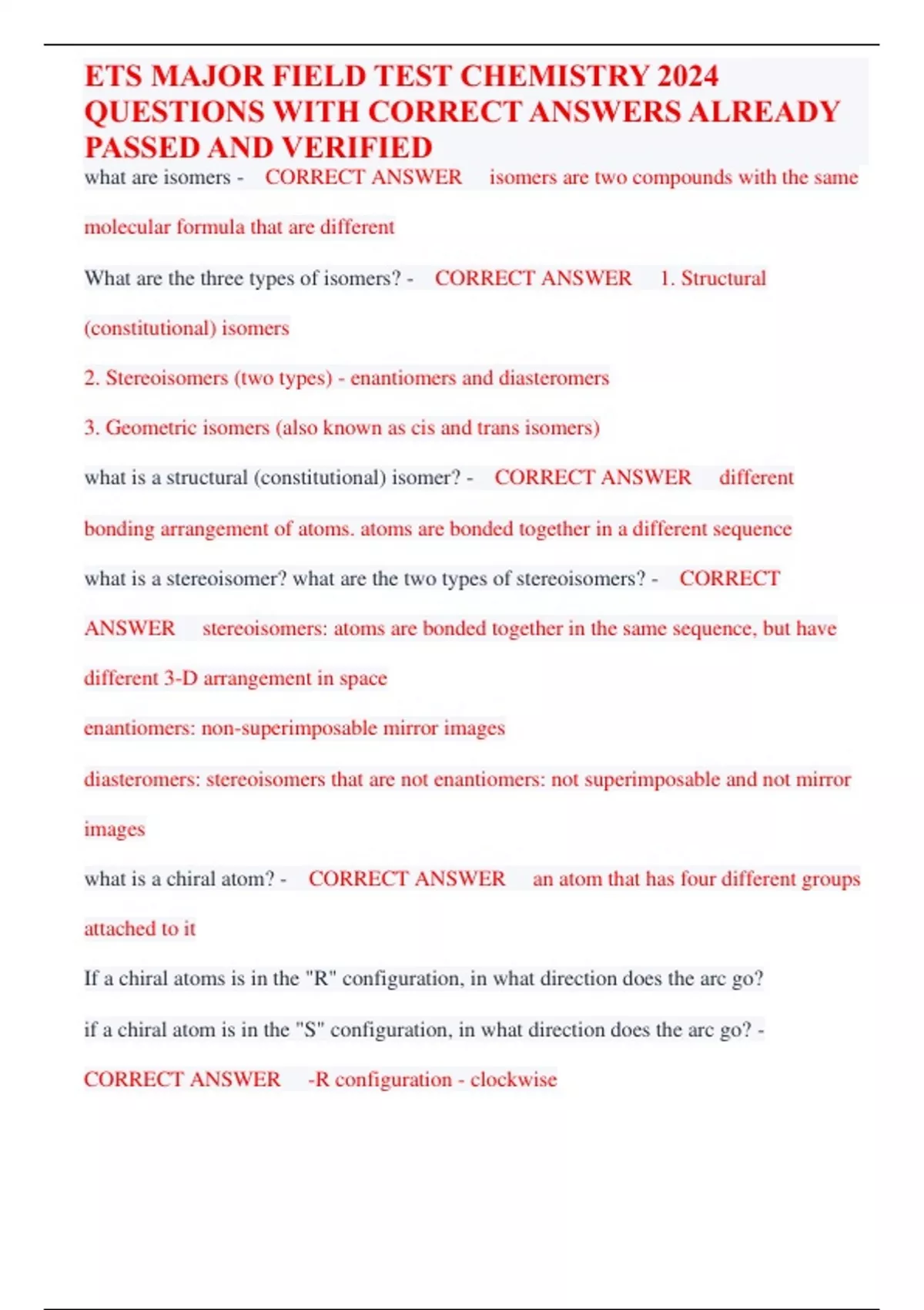 what are isomers - CORRECT ANSWER isomers are two compounds with the same molecular formula that are different What are the three types of isomers? - CORRECT ANSWER 1. Structural (constitutional) isomers 2. Stereoisomers (two types) - enantiomers and diasteromers 3. Geometric isomers (also known as cis and trans isomers) what is a structural (constitutional) isomer? - CORRECT ANSWER different bonding arrangement of atoms. atoms are bonded together in a different sequence what is a stereoisomer? what are the two types of stereoisomers? - CORRECT ANSWER stereoisomers: atoms are bonded together in the same sequence, but have different 3-D arrangement in space enantiomers: non-superimposable mirror images diasteromers: stereoisomers that are not enantiomers: not superimposable and not mirror images what is a chiral atom? - CORRECT ANSWER an atom that has four different groups attached to it If a chiral atoms is in the "R" configuration, in what direction does the arc go? if a chiral atom is in the "S" configuration, in what direction does the arc go? - CORRECT ANSWER -R configuration - clockwise