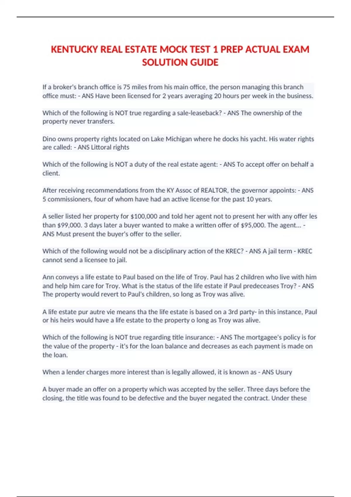 KENTUCKY REAL ESTATE MOCK TEST 1 PREP ACTUAL EXAM SOLUTION GUIDE