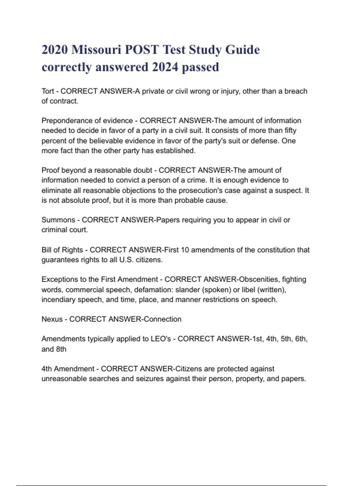 2020 Missouri POST Test Study Guide correctly answered 2024 passed