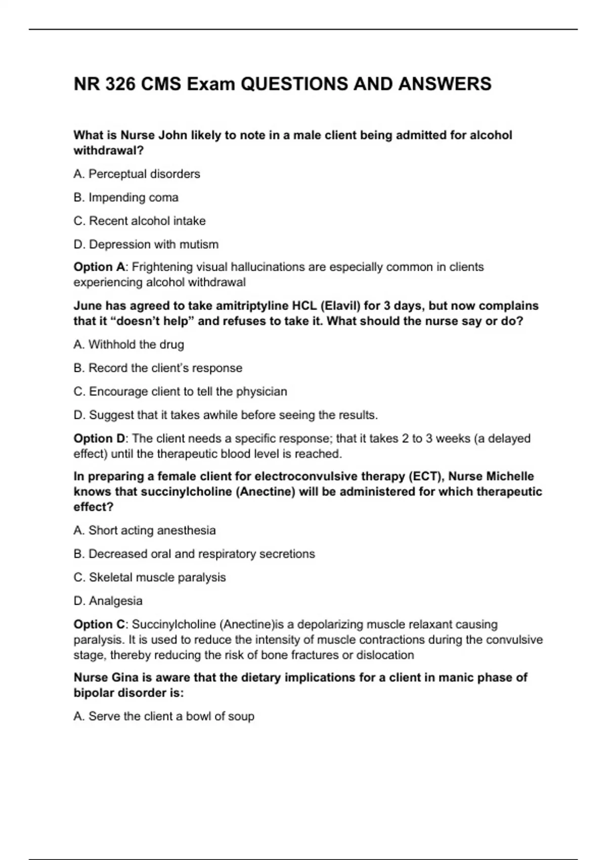 NR 326 CMS Exam What is Nurse John likely to note in a male client being admitted for alcohol withdrawal? A. Perceptual disorders B. Impending coma C. Recent alcohol intake D. Depression with mutism Option A: Frightening visual hallucinations are especially common in clients experiencing alcohol withdrawal June has agreed to take amitriptyline HCL (Elavil) for 3 days, but now complains that it “doesn’t help” and refuses to take it. What should the nurse say or do? A. Withhold the drug B. Record the client’s response C. Encourage client to tell the physician D. Suggest that it takes awhile before seeing the results. Option D: The client needs a specific response; that it takes 2 to 3 weeks (a delayed effect) until the therapeutic blood level is reached. In preparing a female client for electroconvulsive therapy (ECT), Nurse Michelle knows that succinylcholine (Anectine) will be administered for which therapeutic effect? A. Short acting anesthesia B. Decreased oral and respiratory secretions C. Skeletal muscle paralysis D. Analgesia Option C: Succinylcholine (Anectine)is a depolarizing muscle relaxant causing paralysis. It is used to reduce the intensity of muscle contractions during the convulsive stage, thereby reducing the risk of bone fractures or dislocation Nurse Gina is aware that the dietary implications for a client in manic phase of bipolar disorder is: A. Se