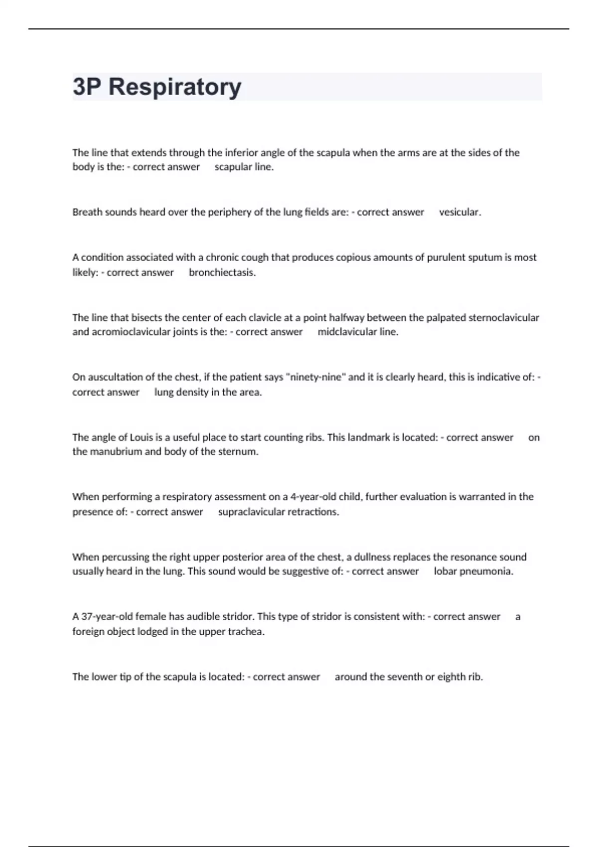 The line that extends through the inferior angle of the scapula when the arms are at the sides of the body is the: - correct answer scapular line. Breath sounds heard over the periphery of the lung fields are: - correct answer vesicular. A condition associated with a chronic cough that produces copious amounts of purulent sputum is most likely: - correct answer bronchiectasis. The line that bisects the center of each clavicle at a point halfway between the palpated sternoclavicular and acromioclavicular joints is the: - correct answer midclavicular line. On auscultation of the chest, if the patient says "ninety-nine" and it is clearly heard, this is indicative of: - correct answer lung density in the area. The angle of Louis is a useful place to start counting ribs. This landmark is located: - correct answer on the manubrium and body of the sternum. When performing a respiratory assessment on a 4-year-old child, further evaluation is warranted in the presence of: - correct answer supraclavicular retractions. When percussing the right upper posterior area of the chest, a dullness replaces the resonance sound usually heard in the lung. This sound would be suggestive of: - correct answer lobar pneumonia. A 37-year-old female has audible stridor. This type of stridor is consistent with: - correct answer a foreign object lodged in the upper trachea. The lower tip of the scapula is located: - correct answer around the seventh or eighth rib. Stridor heard louder in the neck than over the chest wall indicates: - correct answer a partial obstruction in the larynx. Which one of the following infants should be seen immediately by the nurse practitioner? - correct answer A two- week- old infant with nasal congestion and a respiratory rate of 64 breaths/minute The midaxillary line: - correct answer runs down from the apex of the axilla and lies between and parallel to the anterior and posterior lines. Adventitious breath sounds, such as crackles, are: - correct answer popping, frying sounds, may be low or high- pitched and usually heard on inspiration. When examining a patient for chest expansion, begin by: - correct answer placing the thumbs of the examiner at about the level of the tenth ribs with the fingers loosely grasping and parallel to the lateral rib cage. One of the anterior thoracic landmarks is the costal angle. It is located: - correct answer where the right and left costal margins form an angle where they meet at the xiphoid process. When percussing the lower posterior chest, begin by: - correct answer standing on the side rather than directly behind the patient. A 65-year-old man presents with complaints of daytime sleepiness, unrestful sleep, and loud snoring. These symptoms are MOST consistent with: - correct answer obstructive sleep apnea (OSA). Breath sounds heard on chest over the hilar region are: - correct answer bronchovesicular. The middle section of the thoracic cavity containing the esophagus, trachea, heart, and great vessels is the: - correct answer mediastinum. A patient who presents with a long history of cigarette smoking exhibits a dry to productive cough with dyspnea and weight loss. These symptoms could be consistent with: - correct answer a neoplasm of the lung. The hilar region of the lungs describes: - correct answer the area around the heart. A deviated trachea could be caused by all of the following except: - correct answer pneumonia. When inspecting the chest for respiratory effort, which one of the following is not part of the inspection? - correct answer Assessment for tactile fremitus. To document chest findings located at the lowermost portion of the lungs, which one of the following terms would be used? - correct answer Bases of the lungs Breath sounds auscultated over the periphery of the lung fields are quiet and wispy during the inspiratory phase followed by a short, almost silent expiratory phase. These breath sounds are considered: - correct answer vesicular. Respiratory effort in the neonate is initiated at birth as a result of: - correct answer chemical, thermal, and mechanical factors. Factors that aggravate costochondritis may include: - correct answer movement of the chest, trunk, and arms. A 48-year-old woman states that she began smoking about 10 cigarettes per day at 20 years of age. How should this subjective history be documented? - correct answer 14 pack year history Diminished breath sounds should be interpreted as: - correct answer an abnormal finding warranting further evaluation. When auscultating breath sounds, use the diaphragm of the stethoscope by placing it initially on the: - correct answer posterior chest at the cervical 7 level. To document chest findings located between the scapulae, which one of the following terms would be used? - correct answer