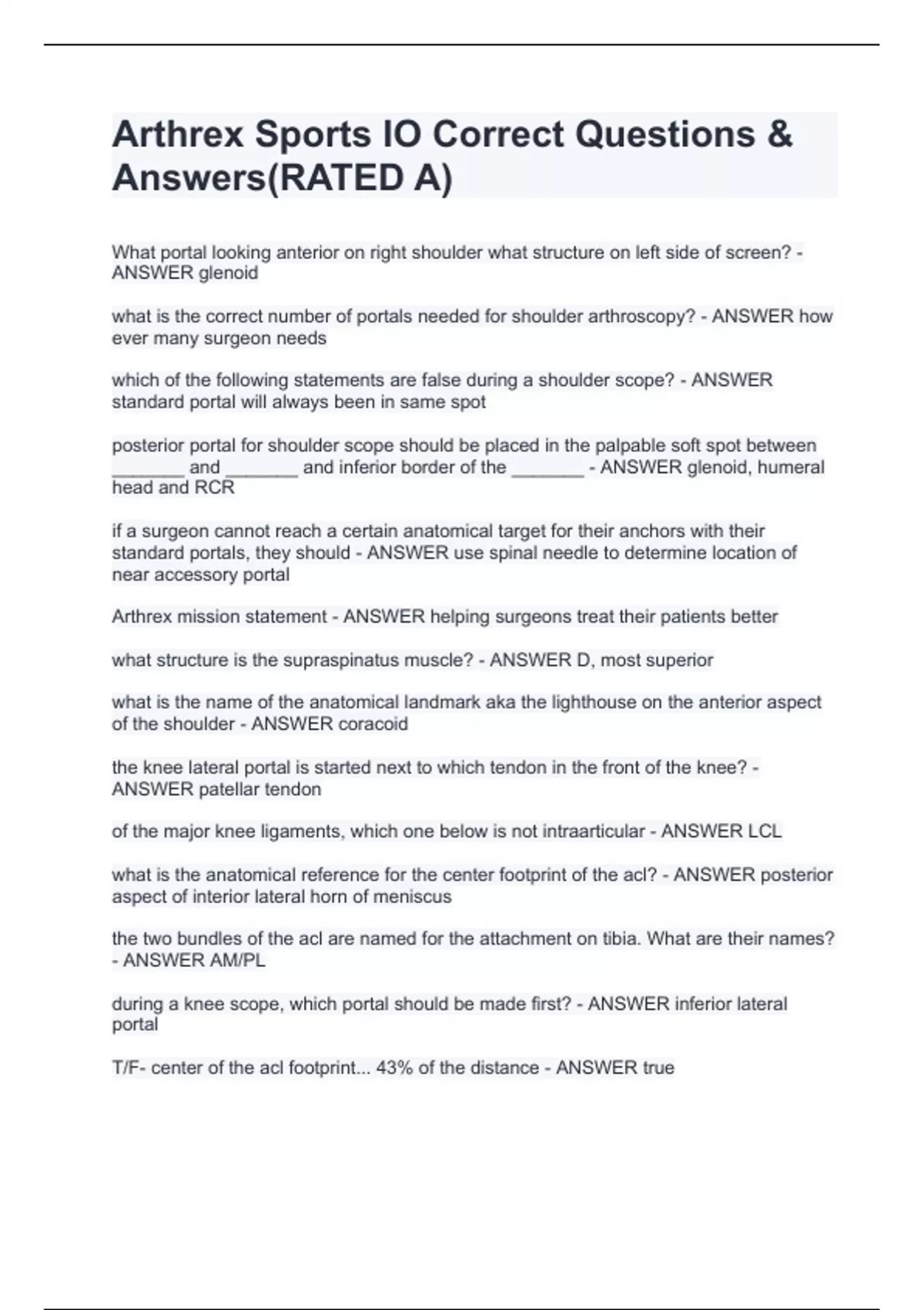 Arthrex Sports IO Correct Questions & Answers(RATED A)