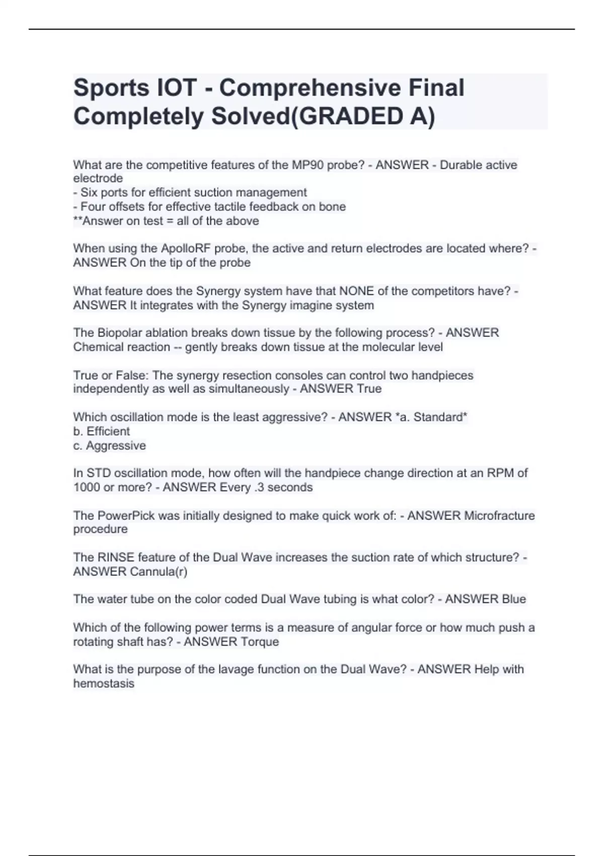 What are the competitive features of the MP90 probe? - ANSWER - Durable active electrode - Six ports for efficient suction management - Four offsets for effective tactile feedback on bone **Answer on test = all of the above When using the ApolloRF probe, the active and return electrodes are located where? - ANSWER On the tip of the probe What feature does the Synergy system have that NONE of the competitors have? - ANSWER It integrates with the Synergy imagine system The Biopolar ablation breaks down tissue by the following process? - ANSWER Chemical reaction -- gently breaks down tissue at the molecular level True or False: The synergy resection consoles can control two handpieces independently as well as simultaneously - ANSWER True