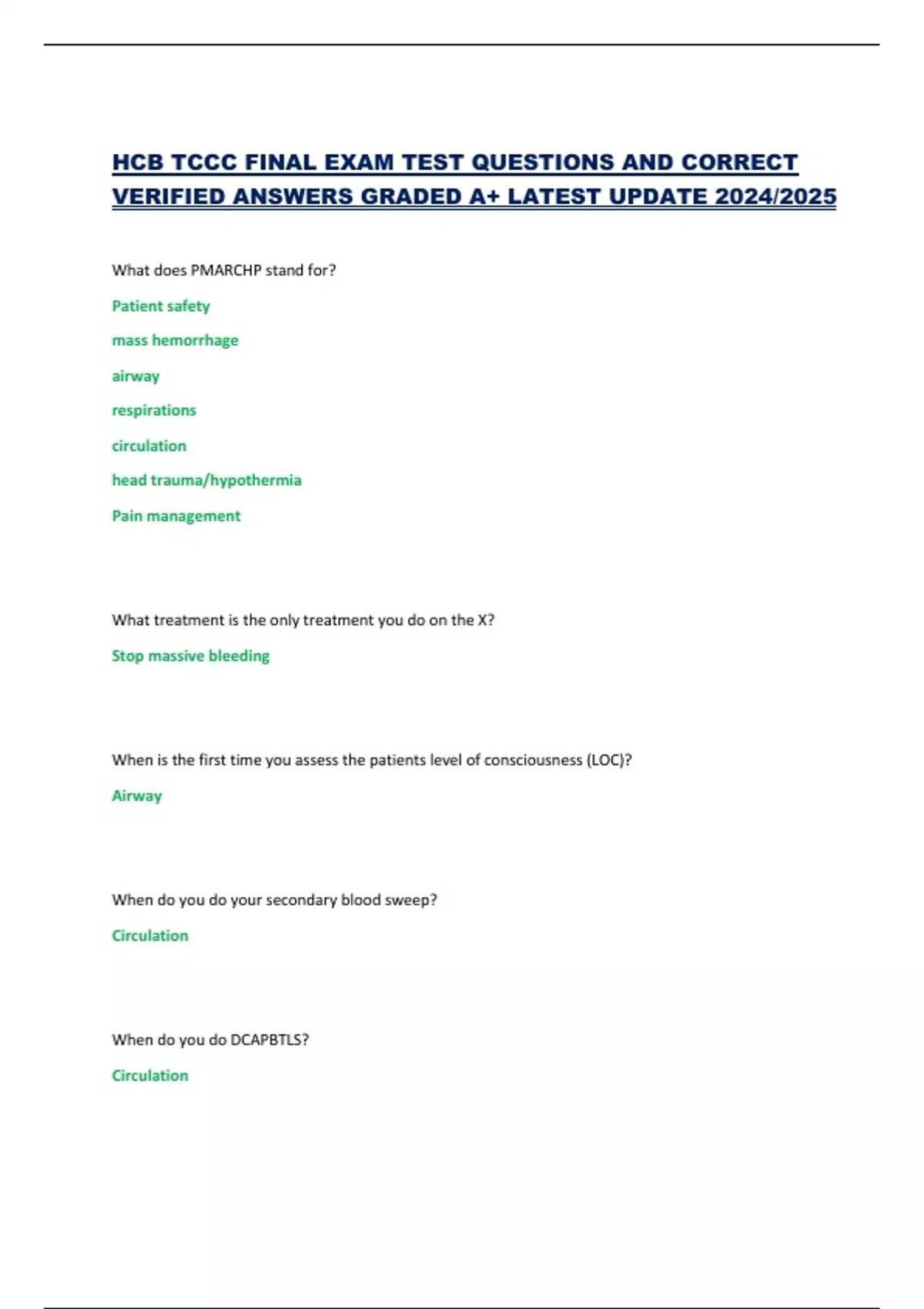 HCB TCCC FINAL EXAM TEST QUESTIONS AND CORRECT VERIFIED ANSWERS GRADED A+ LATEST UPDATE 2024/2025
