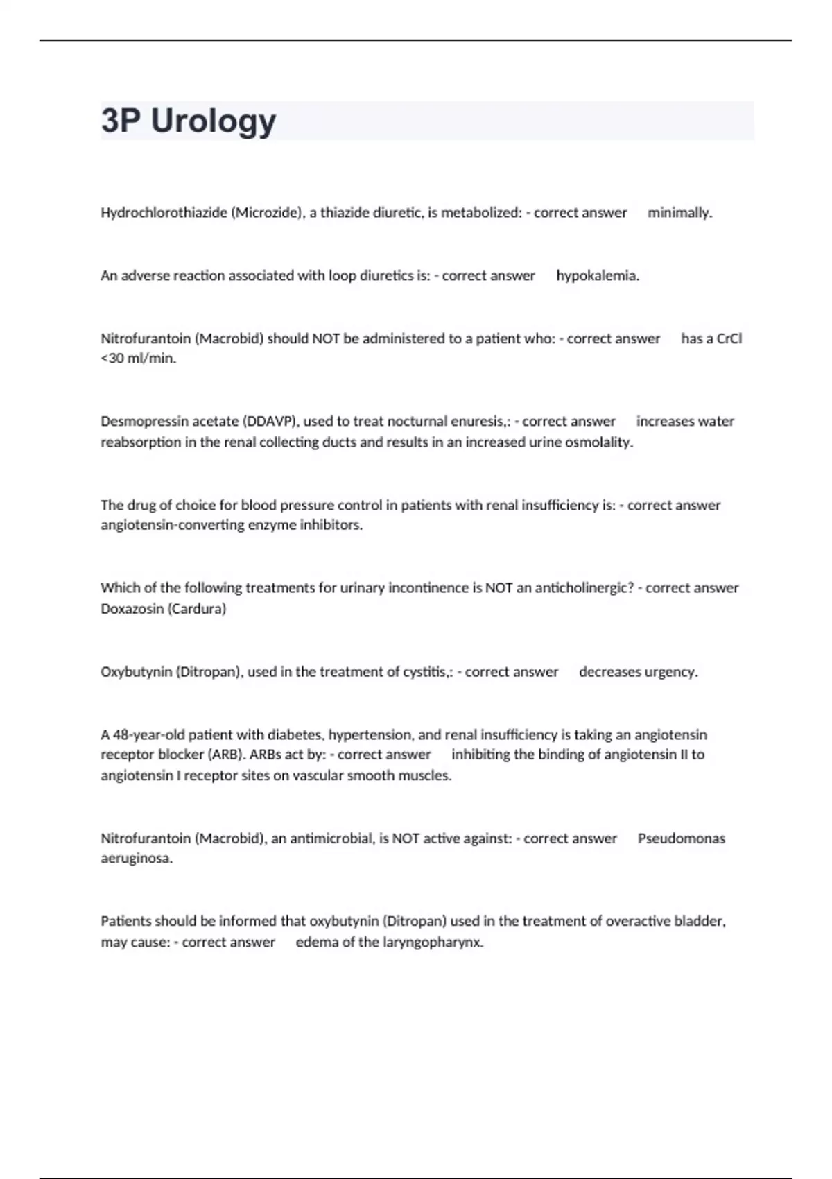 Hydrochlorothiazide (Microzide), a thiazide diuretic, is metabolized: - correct answer minimally. An adverse reaction associated with loop diuretics is: - correct answer hypokalemia. Nitrofurantoin (Macrobid) should NOT be administered to a patient who: - correct answer has a CrCl <30 ml/min. Desmopressin acetate (DDAVP), used to treat nocturnal enuresis,: - correct answer increases water reabsorption in the renal collecting ducts and results in an increased urine osmolality. The drug of choice for blood pressure control in patients with renal insufficiency is: - correct answer angiotensin-converting enzyme inhibitors. Which of the following treatments for urinary incontinence is NOT an anticholinergic? - correct answer Doxazosin (Cardura) Oxybutynin (Ditropan), used in the treatment of cystitis,: - correct answer decreases urgency. A 48-year-old patient with diabetes, hypertension, and renal insufficiency is taking an angiotensin receptor blocker (ARB). ARBs act by: - correct answer inhibiting the binding of angiotensin II to angiotensin I receptor sites on vascular smooth muscles. Nitrofurantoin (Macrobid), an antimicrobial, is NOT active against: - correct answer Pseudomonas aeruginosa. Patients should be informed that oxybutynin (Ditropan) used in the treatment of overactive bladder, may cause: - correct answer edema of the laryngopharynx. When using ciprofloxacin (Cipro) for the treatment of urinary tract infections (UTIs), the patient should be monitored for: - correct answer tendinitis and tendon rupture. In the case of non-gonococcal urethritis, the patient should be treated with: - correct answer azithromycin (Zithromax) 1 gram orally. Finasteride (Proscar): - correct answer is unsafe if handled during pregnancy and lactation. Patients taking mirabegron (Myrbetriq) should be monitored for: - correct answer hypertension. Which of the following is a beta 3 adrenergic agonist used in the treatment of overactive bladder? - correct answer Mirabegron (Myrbetriq) Patients receiving imipramine (Tofranil) for the treatment of nocturnal enuresis should be advised to: - correct answer use sunscreen when outdoors. Fluoroquinolones are associated with: - correct answer tendinitis and hypoglycemia. Initial and routine monitoring for patients who are receiving tamsulosin (Flomax) should include: - correct answer prostate-specific antigen. Thiazide diuretics are contraindicated in patients who have: - correct answer a hypersensitivity to sulfonamides. The recommended treatment option for uncomplicated urinary tract infections (UTIs) in children between the ages of 2 and 13 who have an allergy to cephalosporin is: - correct answer Trimethoprim/sulfamethoxazole (Bactrim) The brand name of imipramine, used in the treatment of nocturnal enuresis, is: - correct answer Tofranil. Oxybutynin (Ditropan), used in the treatment of dysuria, is classified as an: - correct answer anti-spasmodic agent. Cefixime (Suprax) used for treatment of urinary tract infections (UTIs) is a: - correct answer third-generation cephalosporin. In the treatment of urinary tract infections (UTIs), sulfa agents: - correct answer block the synthesis of folic acid by bacteria and inhibit replication. A 23-year-old patient with an uncomplicated urinary tract infection (UTI) is allergic to sulfamethoxazole/trimethoprim (Bactrim). This patient should be treated with: - correct answer Cipro. The first-line treatment option for uncomplicated urinary tract infection (UTI) in children between 2 and 13 years of age is: - correct answer cefixime (Suprax). Urinary antispasmodic drugs used for the treatment of overactive bladder belong to a class of medications known as: - correct answer muscarinic receptor antagonists. In patients with chronic kidney disease (CKD), regardless of race or diabetes status, the initial recommended therapy for hypertension to improve kidney outcomes is: - correct answer angiotensin-converting enzyme inhibitors. A 28-year-old man presents with urethritis. He should initially be treated with: - correct answer azithromycin 1 gram orally plus ceftriaxone 250 mg intramuscularly. Patients receiving oxybutynin (Ditropan) should be advised to: - correct answer drink plenty of water and avoid overheating. In the treatment of renal insufficiency, the loop diuretic that has the longest half-life is: - correct answer torsemide (Demadex). A few first-generation cephalosporins, such as cephalexin (Keflex), have some gram-negative coverage against: - correct answer Escherichia coli. The "DS" in trimethoprim- sulfamethoxazole (Bactrim DS) for use in treatment of urinary tract infection stands for: - corr