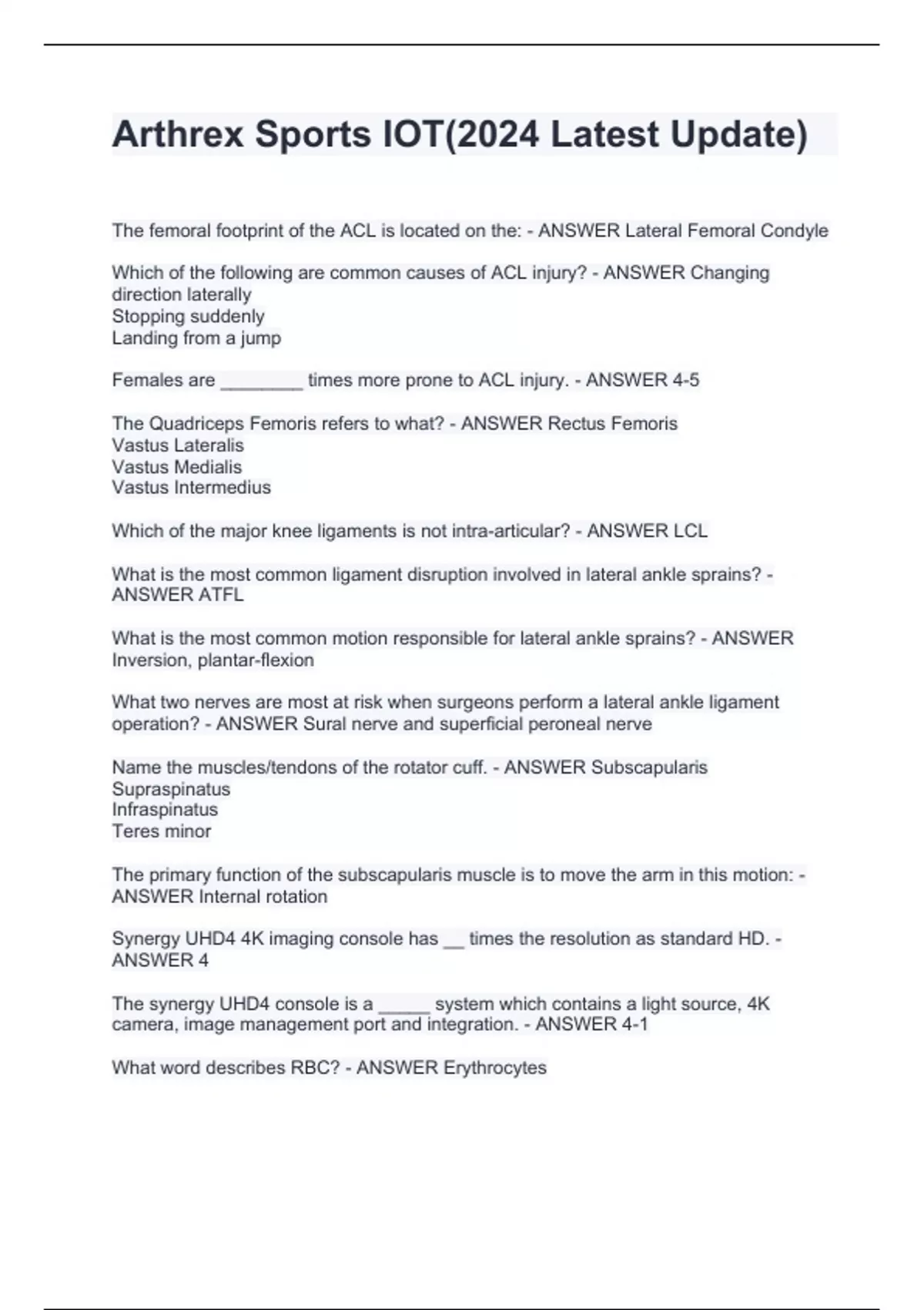 The femoral footprint of the ACL is located on the: - ANSWER Lateral Femoral Condyle Which of the following are common causes of ACL injury? - ANSWER Changing direction laterally Stopping suddenly Landing from a jump Females are ________ times more prone to ACL injury. - ANSWER 4-5 The Quadriceps Femoris refers to what? - ANSWER Rectus Femoris Vastus Lateralis Vastus Medialis Vastus Intermedius Which of the major knee ligaments is not intra-articular? - ANSWER LCL What is the most common ligament disruption involved in lateral ankle sprains? - ANSWER ATFL What is the most common motion responsible