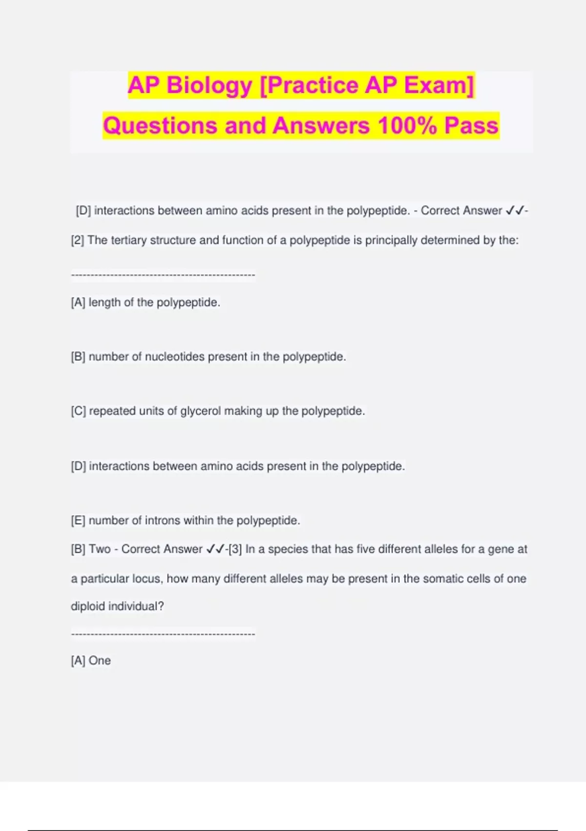 AP Biology [Practice AP Exam] Questions and Answers 100% Pass [D] interactions between amino acids present in the polypeptide. - Correct Answer ️️ - [2] The tertiary structure and function of a polypeptide is principally determined by the: ----------------------------------------------- [A] length of the polypeptide. [B] number of nucleotides present in the polypeptide. [C] repeated units of glycerol making up the polypeptide. [D] interactions between amino acids present in the polypeptide. [E] number of introns within the polypeptide. [B] Two - Correct Answer ️️ -[3] In a species that has five different alleles for a gene at a particular locus, how many different alleles may be present in the somatic cells of one diploid individual? ----------------------------------------------- [A] One [B] Two [C] Three [D] Four [E] Five [C] swell and lyse - Correct Answer ️️ -[4] If red blood cells cultured in an isotonic medium are placed in distilled water, they will most likely: ----------------------------------------------- [A] remain unchanged [B] shrivel [C] swell and lyse [D] divide [E] become dormant [A] A triglyceride - Correct Answer ️️ -[7] Metabolism of which the following molecules results in the greatest net usable energy per gram? ----------------------------------------------- [A] A triglyceride [B] A tripetide [C] An alpha-linked disaccharide [D] A beta-linked disaccharide [E] An anabolic steriod [B] rough endoplasmic reticulum - Correct Answer ️️ -[8] Cells that make up salivary glands would be expected to contain a relatively large amount of: ----------------------------------------------- [A] smooth endoplasmic reticulum [B] rough endoplasmic reticulum [C] genetic material [D] lipids [E] peroxisomes [C] Prokaryotes are structurally less complex than eukaryotes are. - Correct Answer ️️ -[9] Which of the following characteristics distinguishes prokaryotic organisms from eukaryotic organisms? ----------------------------------------------- [A] Prokaryotes are unicellular, while all eukaryotes are multicellular. [B] Prokaryotes are aquatic, while eukaryotes are terrestrial. [C] Prokaryotes are structurally less complex than eukary