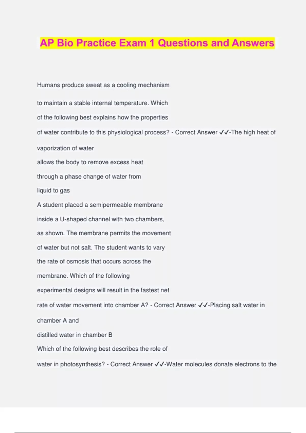 AP Bio Practice Exam 1 Questions and Answers Humans produce sweat as a cooling mechanism to maintain a stable internal temperature. Which of the following best explains how the properties of water contribute to this physiological process? - Correct Answer ️️ -The high heat of vaporization of water allows the body to remove excess heat through a phase change of water from liquid to gas A student placed a semipermeable membrane inside a U-shaped channel with two chambers, as shown. The membrane permits the movement of water but not salt. The student wants to vary the rate of osmosis that occurs across the membrane. Which of the following experimental designs will result in the fastest net rate of water movement into chamber A? - Correct Answer ️️ -Placing salt water in chamber A and distilled water in chamber B Which of the following best describes the role of water in photosynthesis? - Correct Answer ️️ -Water molecules donate electrons to the electron transport chain What evolutionary advantage does compartmentalization of core metabolic processes offer eukaryotes? - Correct Answer ️️ -Evolution of a nucleus in eukaryotes separates the processes of transcription and translation and they can be regulated separately Which of the following best describes the cellular location where pyruvate dehydrogenase is most likely active? - Correct Answer ️️ -The mitochondrial matrix The maximum production rate of acetyl-CoA under condition 1 is closest to which of the following? - Correct Answer ️️ -1 micromole/sec Which of the following observations provides the best evidence that acetyl-CoA negatively regulates pyruvate dehydrogenase activity? - Correct Answer ️️ -The rate of the pyruvate dehydrogenase-catalyzed reaction is slower in the presence of a higher concentration of acetyl-CoA Pyruvate dehydrogenase deficiency is a genetic disease most commonly linked to a mutation in the a -subunit of the mitochondrial enzyme that causes the enzyme to cease functioning. As a result of the mutation, affected individuals build up dangerous amounts of lactic acid. Which of the following best explains the buildup of lactic acid in individuals with the mutation? - Correct Answer ️️ -Cells undergo fermentation because pyruvate cannot be metabolized to proceed into the Krebs cycle The diagram shows how water can adhere to the xylem in the stems of plants, which contributes to water movement in the plant. Which of the following best explains how water is able to move upward from the roots of a plant, through its xylem in the stem, and out to the leaves? - Correct Answer ️️ -Water and the xylem are both polar. Water molecules have the ability to form hydrogen bonds with each other and with the walls of the xylem Protein X activates gene expression only in cells exposed to a specific signaling molecule. In a study, researchers determined the intracellular location of Protein X in cultured cells both before and after exposing the cells to the signaling molecule. The results of the study are shown in the diagram - Correct Answer ️️ -Protein X is a transcription factor The hormone prolactin has varying effects in many different animal species. All vertebrates produce prolactin, which is involved in signal transduction pathways. In mammals, prolactin stimulates the production of milk in mammary glands. In fish, prolactin plays an important role in osmoregulation. In birds, prolactin is involved in lipid metabolism. Which of the following best explains the presence of prolactin in various vertebrate species? - Correct Answer ️️ -Prolactin is a homologous hormone because it has a common origin but different functions in various species Which of the following best describes the production of DMSP by coral and coral symbionts? - Correct Answer ️️ -A negative feedback mechanism that reverses the environmental change Which of the following best describes the effect of temperature on corals' ability to produce DMSP as shown in Figure 1 ? - Correct Answer ️️ -Both juvenile and adult corals produce less