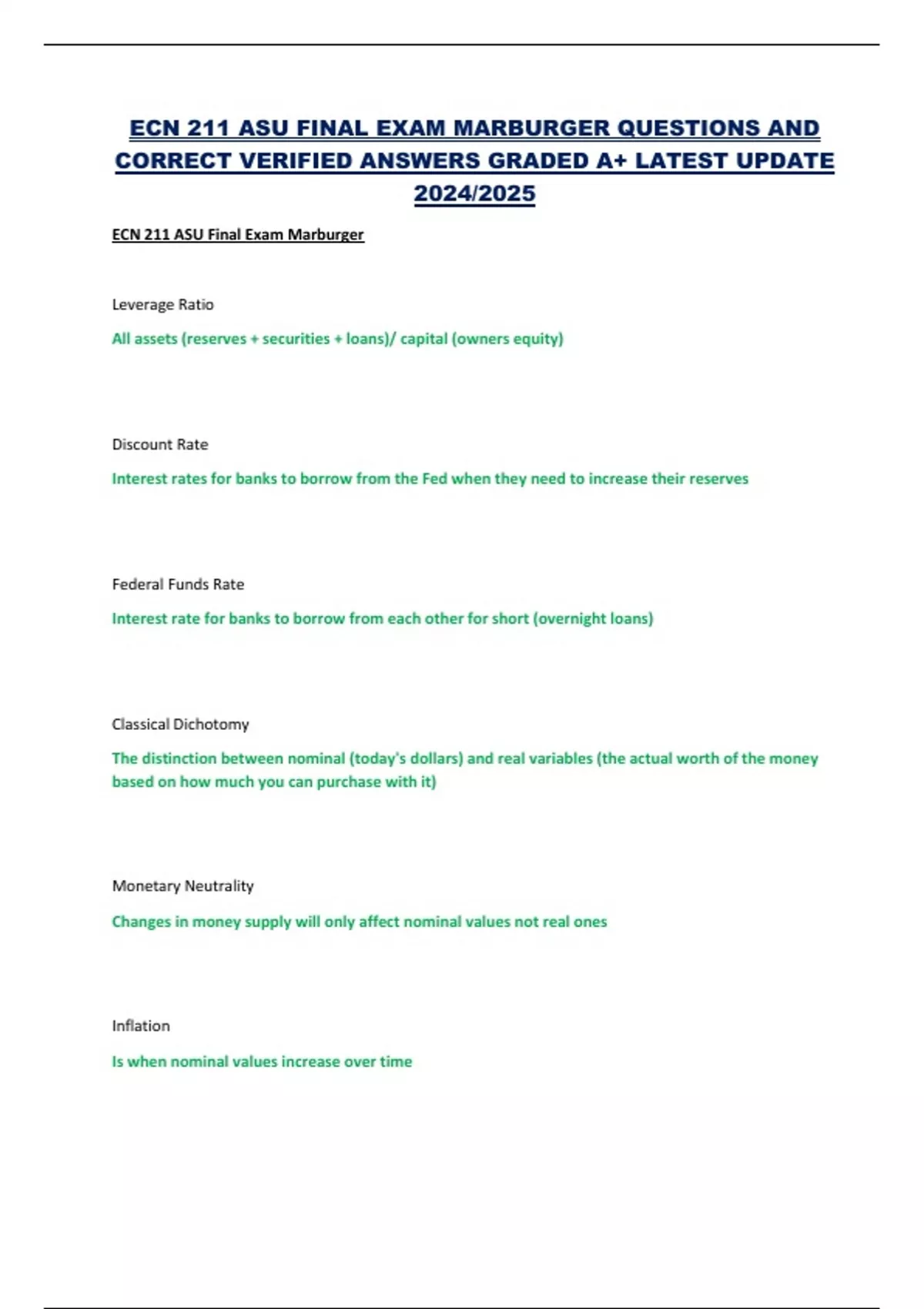 ECN 211 ASU FINAL EXAM MARBURGER QUESTIONS AND CORRECT VERIFIED ANSWERS GRADED A+ LATEST UPDATE 2024/2025