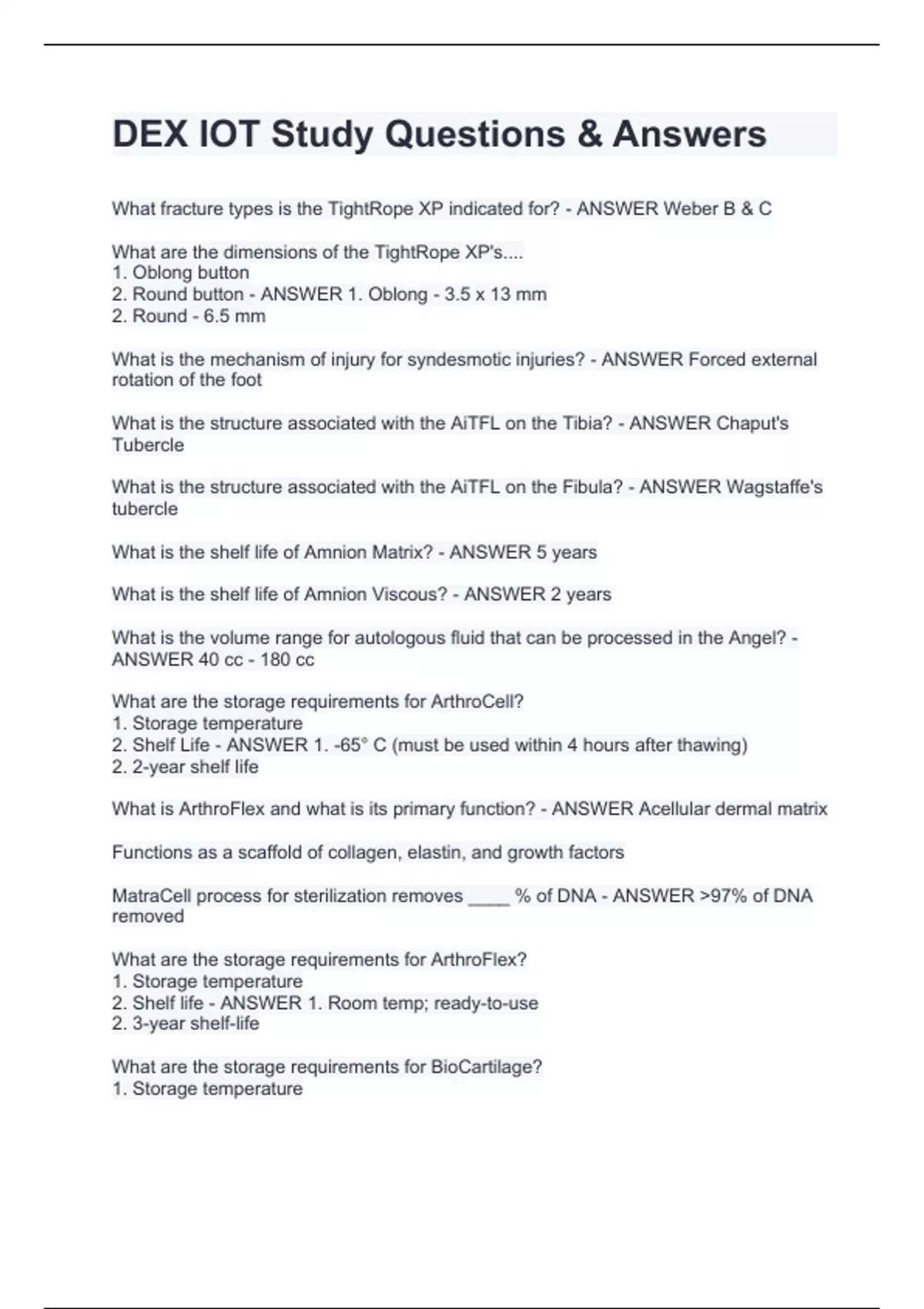 What fracture types is the TightRope XP indicated for? - ANSWER Weber B & C What are the dimensions of the TightRope XP's.... 1. Oblong button 2. Round button - ANSWER 1. Oblong - 3.5 x 13 mm 2. Round - 6.5 mm What is the mechanism of injury for syndesmotic injuries? - ANSWER Forced external rotation of the foot What is the structure associated with the AiTFL on the Tibia? - ANSWER Chaput's Tubercle What is the structure associated with the AiTFL on