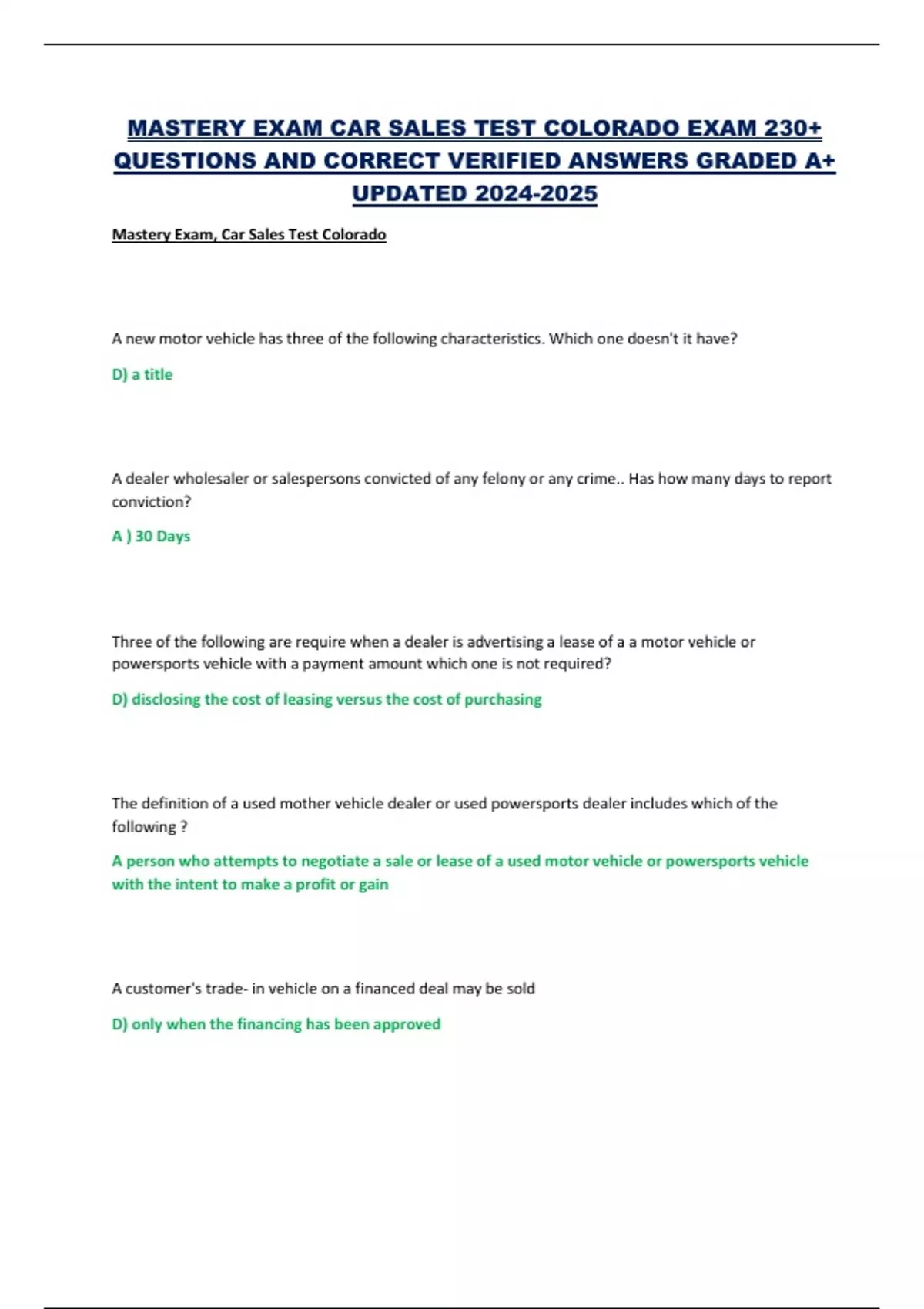 MASTERY EXAM CAR SALES TEST COLORADO EXAM 230+ QUESTIONS AND CORRECT VERIFIED ANSWERS GRADED A+ UPDATED