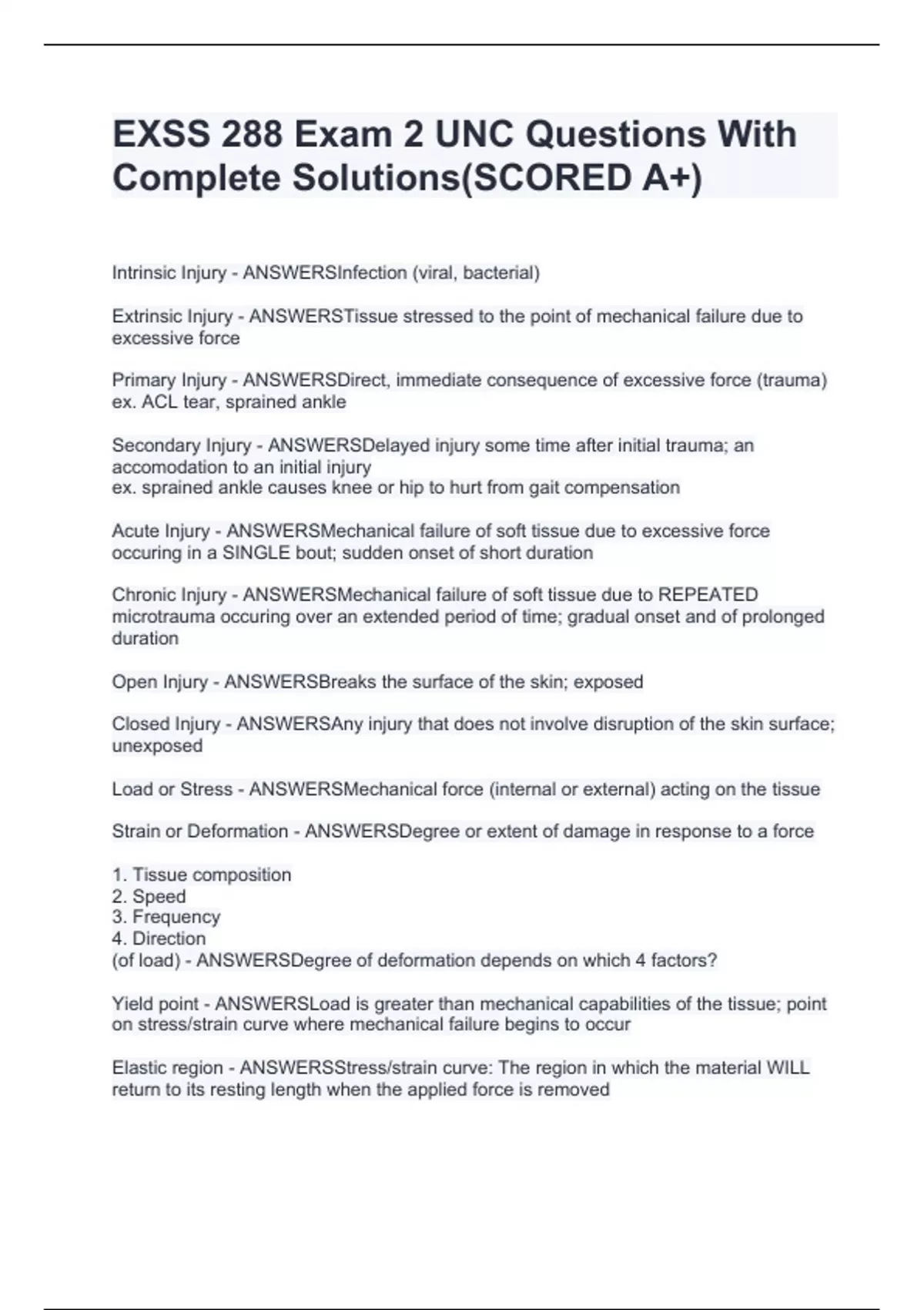 Intrinsic Injury - ANSWERSInfection (viral, bacterial) Extrinsic Injury - ANSWERSTissue stressed to the point of mechanical failure due to excessive force Primary Injury - ANSWERSDirect, immediate consequence of excessive force (trauma) ex. ACL tear, sprained ankle Secondary Injury - ANSWERSDelayed injury some time after initial trauma; an accomodation to an initial injury ex. sprained ankle causes knee or hip to hurt from gait compensation Acute Injury - ANSWERSMechanical failure of soft tissue due to excessive force occuring in a SINGLE bout; sudden onset of short duration Chronic Injury - ANSWERSMechanical failure of soft tissue due to REPEATED microtrauma occuring over an extended period of time; gradual onset and of prolonged duration Open Injury - ANSWERSBreaks the surface of the skin; exposed Closed Injury - ANSWERSAny injury that does not involve disruption of the skin surface; unexposed Load or Stress - ANSWERSMechanical force (internal or external) acting on the tissue Strain or Deformation - ANSWERSDegree or extent of damage in response to a force 1. Tissue composition 2. Speed 3. Frequency 4. Direction (of load) - ANSWERSDegree of deformation depends on which 4 factors? Yield point - ANSWERSLoad is greater than mechanical capabilities of the tissue; point on stress/strain curve where mechanical failure begins to occur Elastic region -