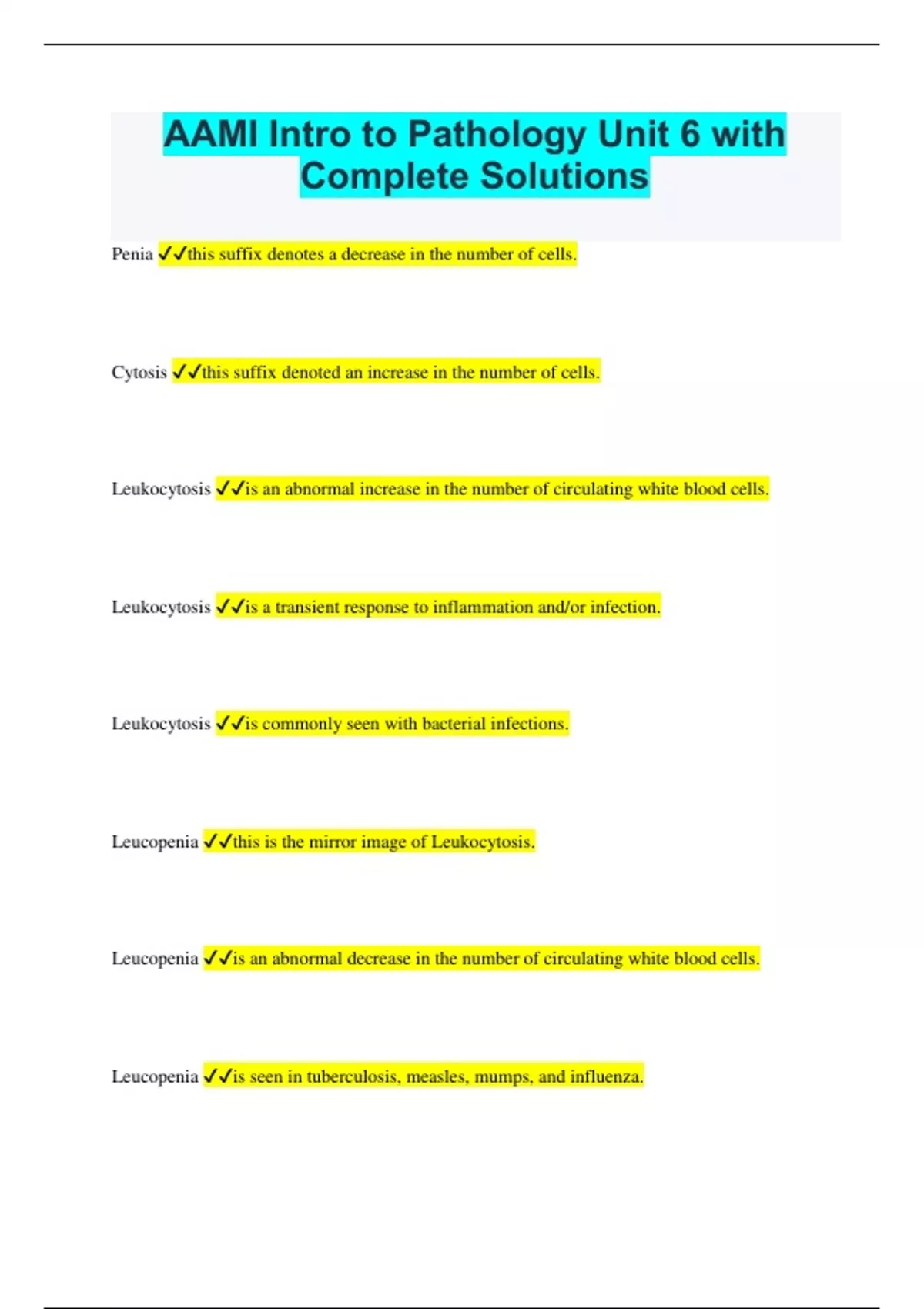 AAMI Intro to Pathology Unit 6 with Complete Solutions Penia this suffix denotes a decrease in the number of cells. Cytosis this suffix denoted an increase in the number of cells. Leukocytosis is an abnormal increase in the number of circulating white blood cells. Leukocytosis is a transient response to inflammation and/or infection. Leukocytosis is commonly seen with bacterial infections. Leucopenia this is the mirror image of Leukocytosis. Leucopenia is an abnormal decrease in the number of circulating white blood cells. Leucopenia is seen in tuberculosis, measles, mumps, and influenza. Anemia is a decrease in the number of red blood cells; a decrease in the amount of hemoglobin; or a combination of both of these. Anemia Causes of ____________ - a decrease in red blood cell production. - an increase in red blood cell destruction. - a loss of red blood cells (bleeding ulcers, malingancies, or excess menstrual bleeding) Anemia Symptoms of ____________ - Pallor (paleness) in the mucous membranes. - Fatigue and weakness due to decreased oxygen delivery to the tissues - Dyspnea (shortness of breath) - Tachycardia (increased heart rate) because of the inadequate amount of oxygen. Primary Anemia anemia due to red blood cell or associated problem. Secondary Anemia anemia as the result of another disease; such as persistent bleeding, leukemia, cancer Leukemia a group of malignant disease characterized by replacement of bone marrow with proliferating white blood cells. Leukemia actually a malignant tumor of the blood forming tissue. Leukemia characterized by an uncontrolled over production of white blood cells which prevents the immature blood cells (erythroblasts) from maturing into erythrocytosis. Leukemia there is a reduction in erythrocytosis and a decrease in platelets (thrombocytes) Leukemia considered to be cancer of the blood or cancer of white blood cells. Leukemia the etiology of this disease is