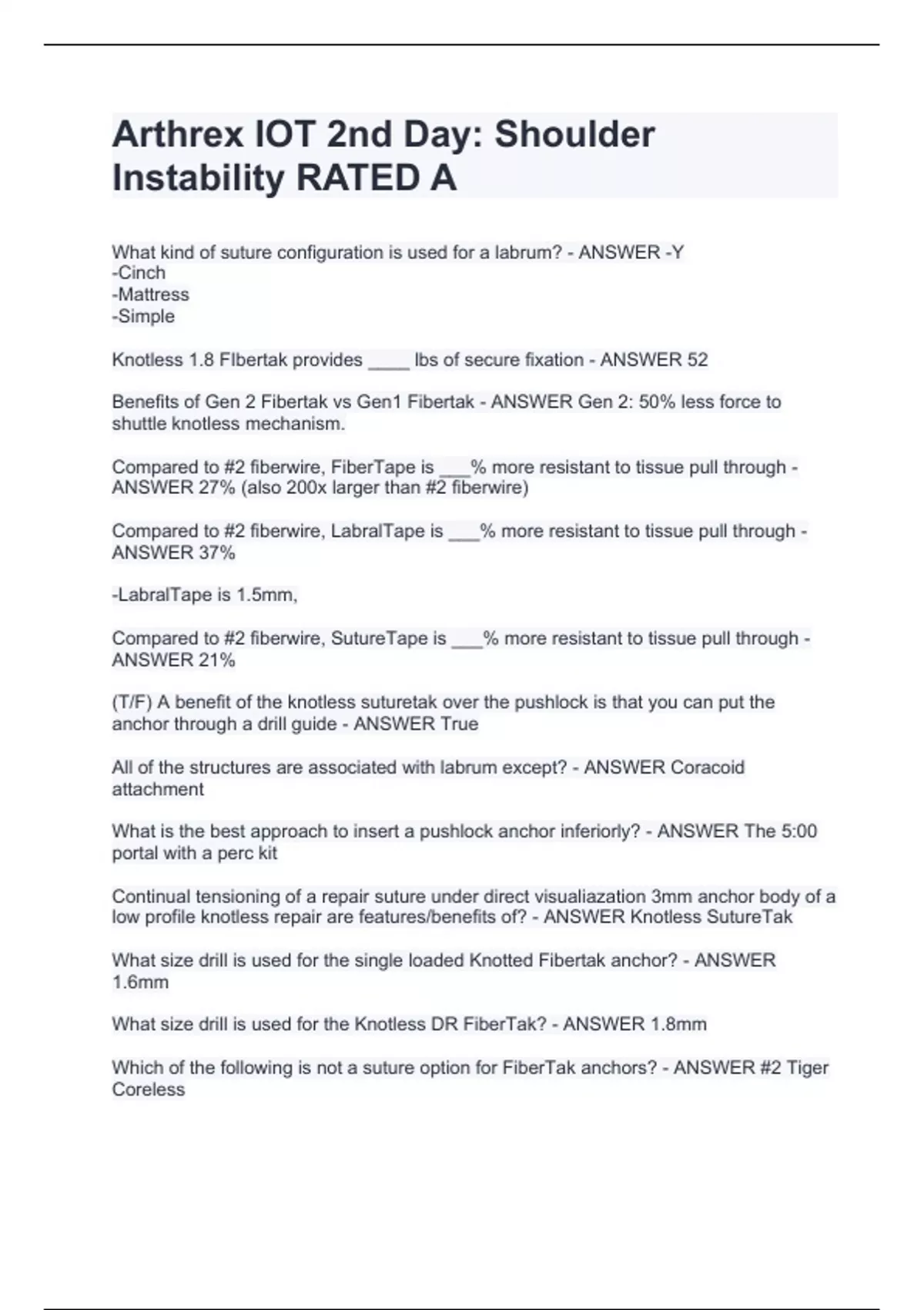 What kind of suture configuration is used for a labrum? - ANSWER -Y -Cinch -Mattress -Simple Knotless 1.8 FIbertak provides ____ lbs of secure fixation - ANSWER 52 Benefits of Gen 2 Fibertak vs Gen1 Fibertak - ANSWER Gen 2: 50% less force to shuttle knotless mechanism. Compared to #2 fiberwire, FiberTape is ___% more resistant to tissue pull through - ANSWER 27% (also 200x larger than #2 fiberwire) Compared to #2 fiberwire, LabralTape is ___% more resistant to tissue pull through - ANSWER 37%
