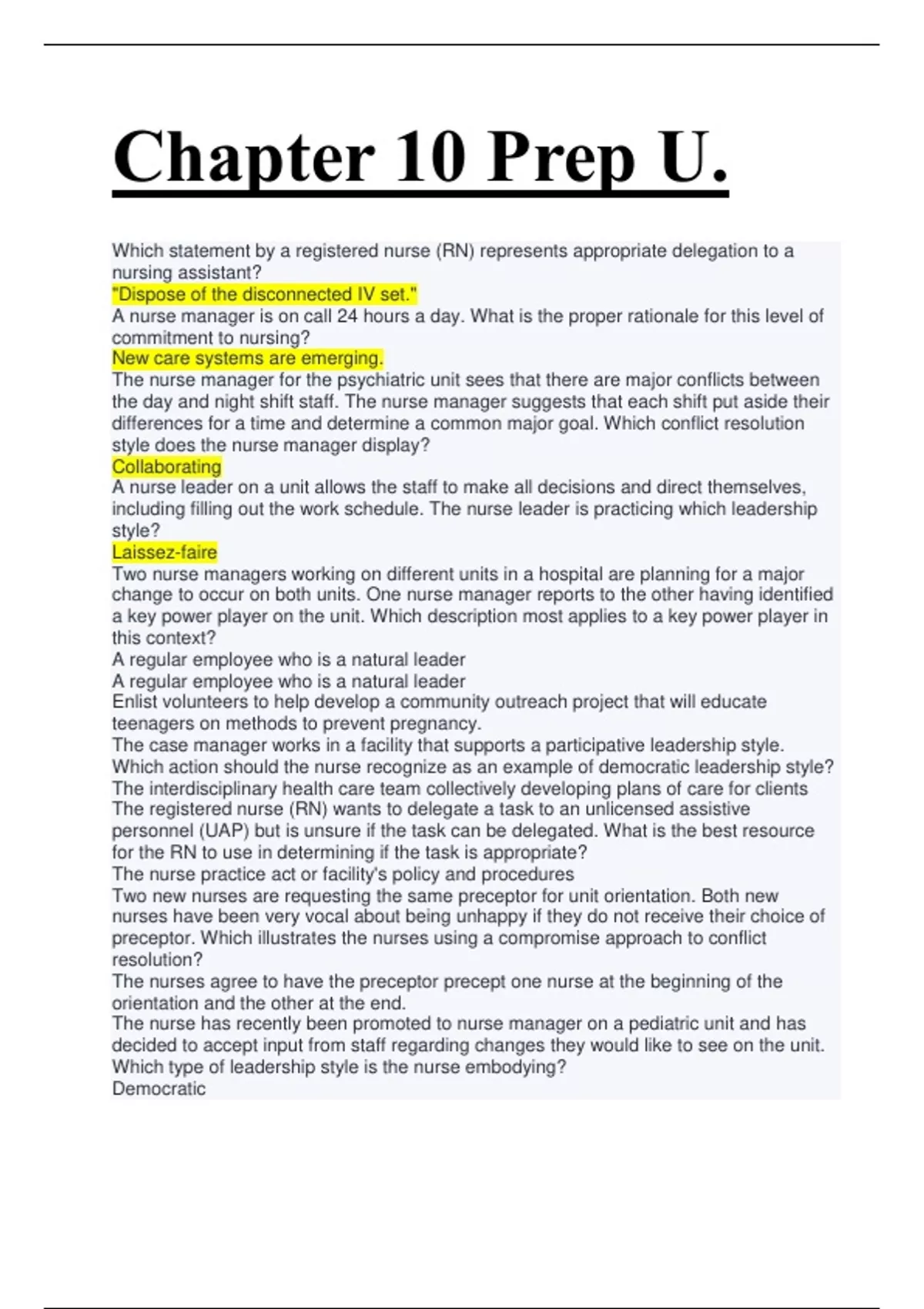 Two nurse managers working on different units in a hospital are planning for a major change to occur on both units. One nurse manager reports to the other having identified a key power player on the unit. Which description most applies to a key power player in this context? A regular employee who is a natural leader A regular employee who is a natural leader Enlist volunteers to help develop a community outreach project that will educate teenagers on methods to prevent pregnancy. The case manager works in a facility that supports a participative leadership style. Which action should the nurse recognize as an example of democratic leadership style? The interdisciplinary health care team collectively developing plans of care for clients The registered nurse (RN) wants to delegate a task to an unlicensed assistive personnel (UAP) but is unsure if the task can be delegated. What is the best resource for the RN to use in determining if the task is appropriate? The nurse practice act or facility's policy and procedures Two new nurses are requesting the same preceptor for unit orientation. Both new nurses have been very vocal about being unhappy if they do not receive their choice of preceptor. Which illustrates the nurses using a compromise approach to conflict resolution? The nurses agree to have the preceptor precept one nurse at the beginning of the orientation and the other at the end. The nurse has recently been promoted to nurse manager on a pediatric unit and has decided to accept input from staff regarding changes they