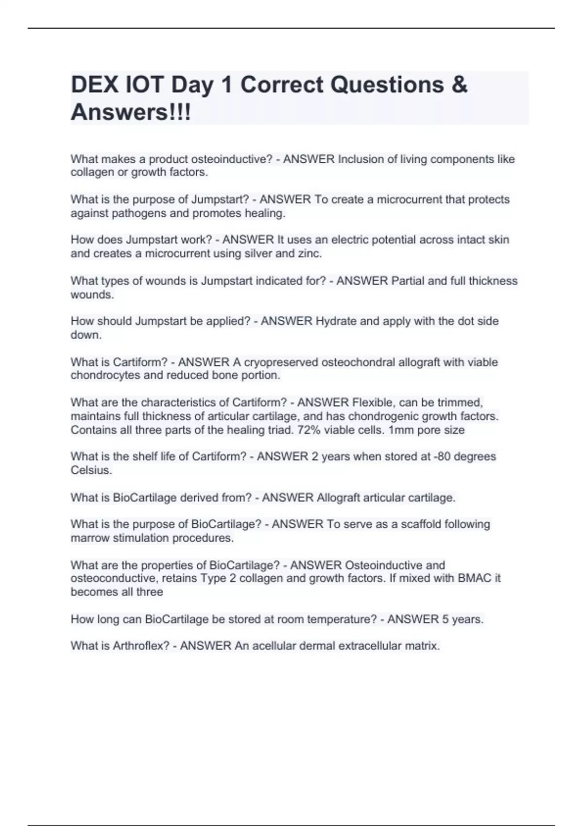 What makes a product osteoinductive? - ANSWER Inclusion of living components like collagen or growth factors. What is the purpose of Jumpstart? - ANSWER To create a microcurrent that protects against pathogens and promotes healing. How does Jumpstart work? - ANSWER It uses an electric potential across intact skin and creates a microcurrent using silver and zinc. What types of wounds is Jumpstart indicated for? - ANSWER Partial and full thickness wounds. How should Jumpstart be applied? - ANSWER Hydrate and apply with the dot side down. What is Cartiform? - ANSWER A cryopreserved osteochondral allograft with viable chondrocytes and reduced bone portion.