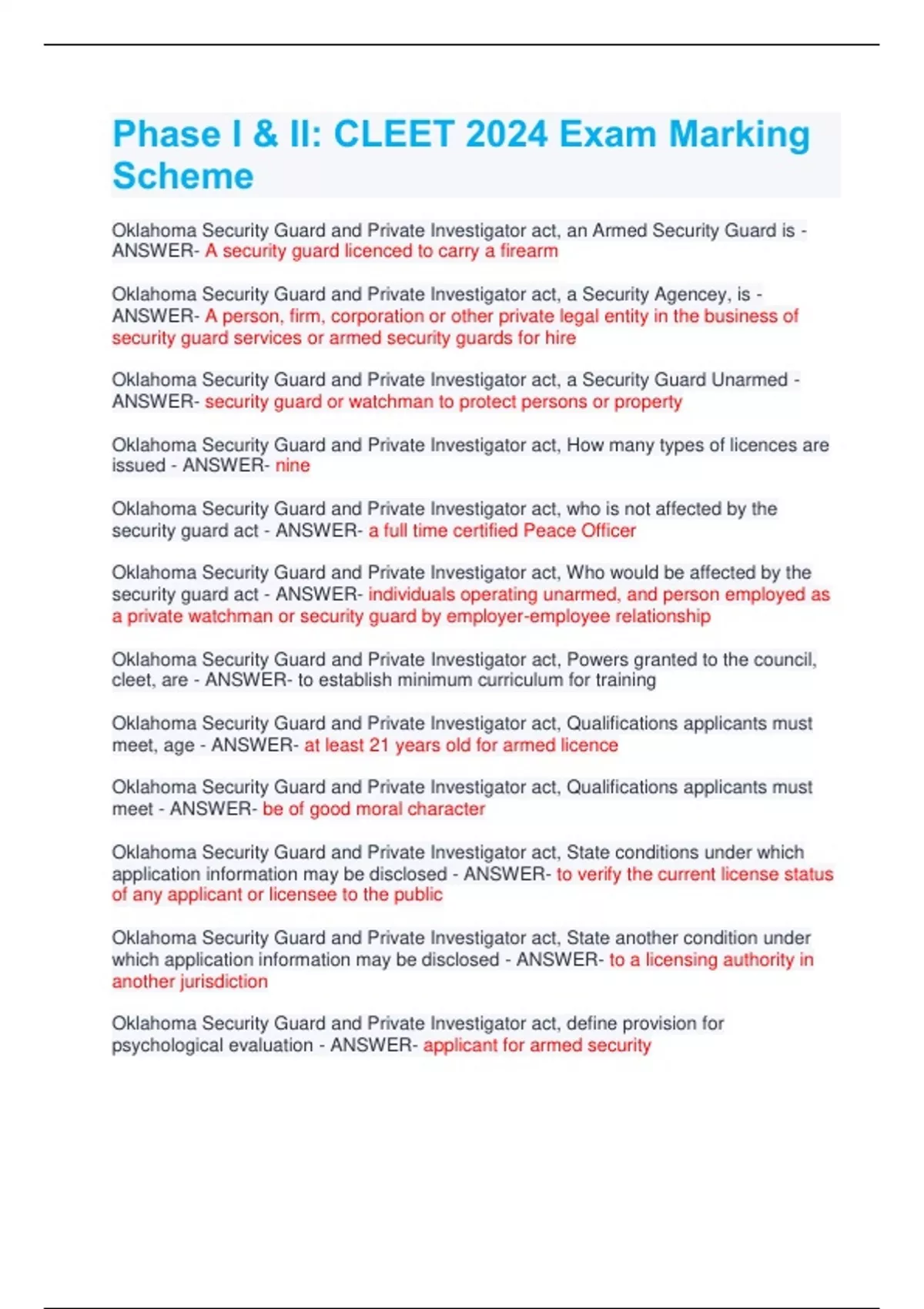 Phase I & II: CLEET 2024 Exam Marking Scheme Oklahoma Security Guard and Private Investigator act, an Armed Security Guard is - ANSWER- A security guard licenced to carry a firearm Oklahoma Security Guard and Private Investigator act, a Security Agencey, is - ANSWER- A person, firm, corporation or other private legal entity in the business of security guard services or armed security guards for hire Oklahoma Security Guard and Private Investigator act, a Security Guard Unarmed - ANSWER- security guard or watchman to protect persons or property Oklahoma Security Guard and Private Investigator act, How many types of licences are issued - ANSWER- nine Oklahoma Security Guard and Private Investigator act, who is not affected by the security guard act - ANSWER- a full time certified Peace Officer Oklahoma Security Guard and Private Investigator act, Who would be affected by the security guard act - ANSWER- individuals operating unarmed, and person employed as a private watchman or security guard by employer-employee relationship Oklahoma Security Guard and Private Investigator act, Powers granted to the council, cleet, are - ANSWER- to establish minimum curriculum for training Oklahoma Security Guard and Private Investigator act, Qualifications applicants must meet, age - ANSWER- at least 21 years old for armed licence Oklahoma Security Guard and Private Investigator act, Qualifications applicants must meet - ANSWER- be of good moral character Oklahoma Security Guard and Private Investigator act, State conditions under which application information may be disclosed - ANSWER- to verify the current license status of any applicant or licensee to the public Oklahoma Security Guard and Private Investigator act, State another condition under which application information may be disclosed - ANSWER- to a licensing authority in another jurisdiction Oklahoma Security Guard and Private Investigator act, define provision for psychological evaluation - ANSWER- applicant for armed security Oklahoma Security Guard and Private Investigator act, Which state fee cost the most - ANSWER- security agency Oklahoma Security Guard and Private Investigator act, conditional licenses - ANSWERfor first six months of a regular licence period Oklahoma Security Guard and Private Investigator act, special event license - ANSWER- no more than 2 in a calendar year Oklahoma Security Guard and Private Investigator act, Identify requirements for, security guard personal, - ANSWER- security officer Oklahoma Security Guard and Private Investigator act, for, vehicle identification - ANSWER- Guard First Aid, a guideline for first aid - ANSWER- do not give first aid if victim refuses it Provide first aid, only, within the scope of your training - ANSWER- First Aid, guideline for first aid State guidelines for responding to accidents and emergencies - ANSWER- call for help immediately First aid kits - ANSWER- Industrial first aid kits are usually painted, federal safety green, with a cross guidelines to help reduce, disease transmission - ANSWER- use protecting clothing and equipment guidelines to first aid, if the cut is small - ANSWER- wash the cut guidelines to first aid, if the cut is severe - ANSWER- put a dressing over the cut and apply pressure early stages of shock - ANSWER- pale or bluish skin that is cool to the touch Late stage of shock - ANSWER- attitude of not caring First Degree Burn - ANSWER- Mild swelling Second Degree Burn - ANSWER- Blistering Third Degree Burn - ANSWER- Charred or white appearance of burned area locate pressure point to control bleeding - ANSWER- brachial artery