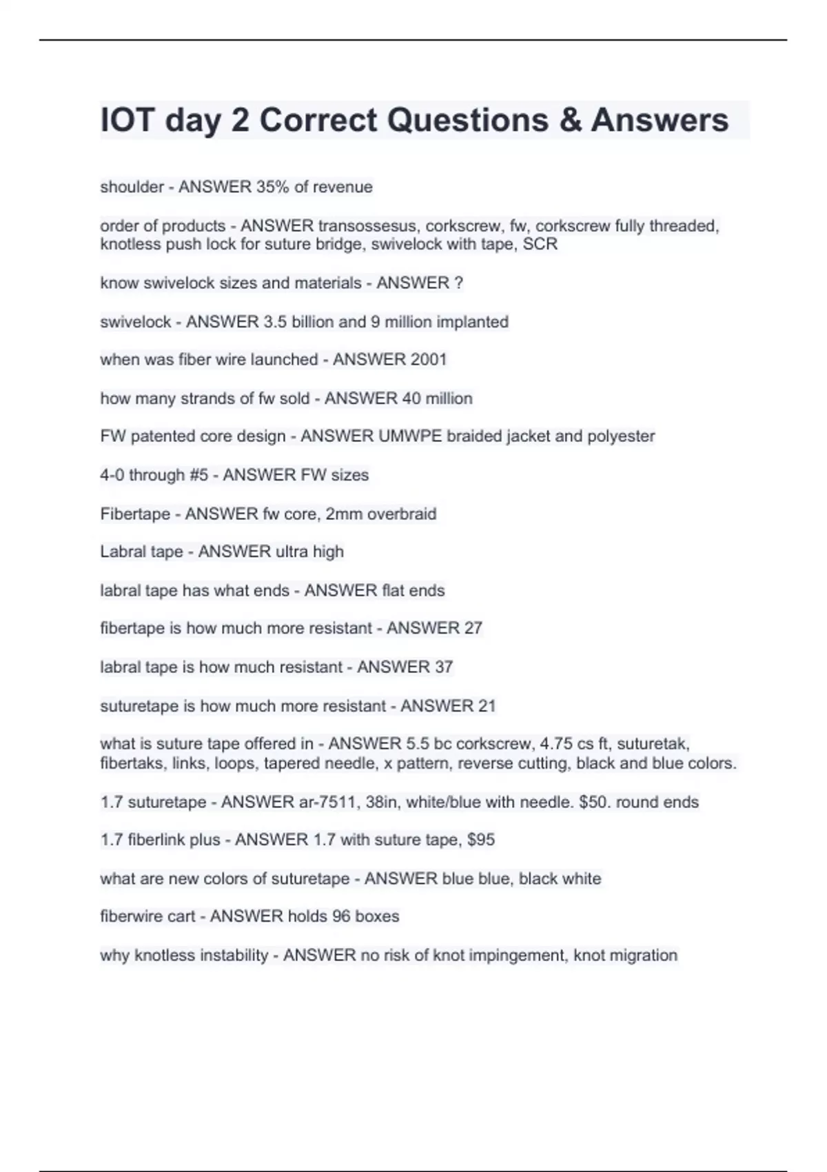 shoulder - ANSWER 35% of revenue order of products - ANSWER transossesus, corkscrew, fw, corkscrew fully threaded, knotless push lock for suture bridge, swivelock with tape, SCR know swivelock sizes and materials - ANSWER ? swivelock - ANSWER 3.5 billion and 9 million implanted when was fiber wire launched - ANSWER 2001 how many strands of fw sold - ANSWER 40 million FW patented core design - ANSWER UMWPE braided jacket and polyester 4-0 through #5 - ANSWER FW sizes