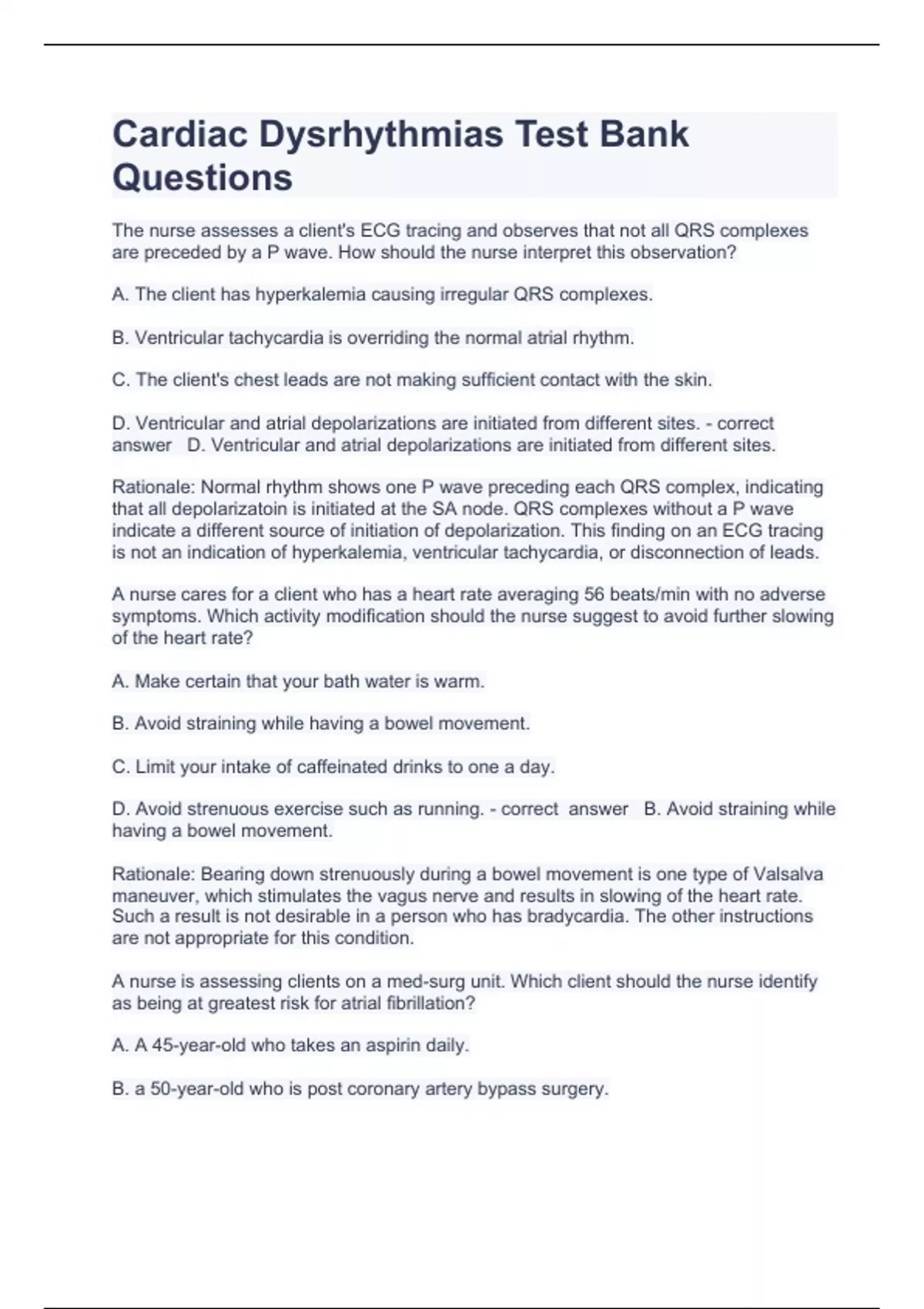 Cardiac Dysrhythmias Test Bank Questions and answers 100% correct 2024