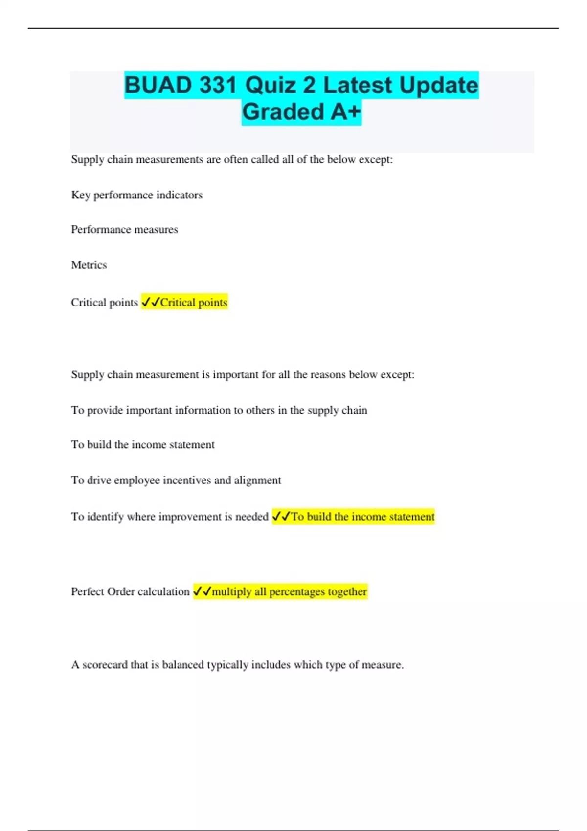 BUAD 331 Quiz 2 Latest Update Graded A+ Supply chain measurements are often called all of the below except: Key performance indicators Performance measures Metrics Critical points Critical points Supply chain measurement is important for all the reasons below except: To provide important information to others in the supply chain To build the income statement To drive employee incentives and alignment To identify where improvement is needed To build the income statement Perfect Order calculation multiply all percentages together A scorecard that is balanced typically includes which type of measure. Financial Quality Learning and Improvement Cycle Time All of the above All of the above End-to-end supply chain measures are the most important type of supply chain metric. True False True Metrics provide a complete picture of supply chain performance. True False False What are the three types of benchmarking discussed? Competitive, Collaborative, Comprehensive Process, Collaborative, Internal Competitive, Process, Collaborative Competitive, Process, Internal Competitive, Process, Internal Data visualization involves using software