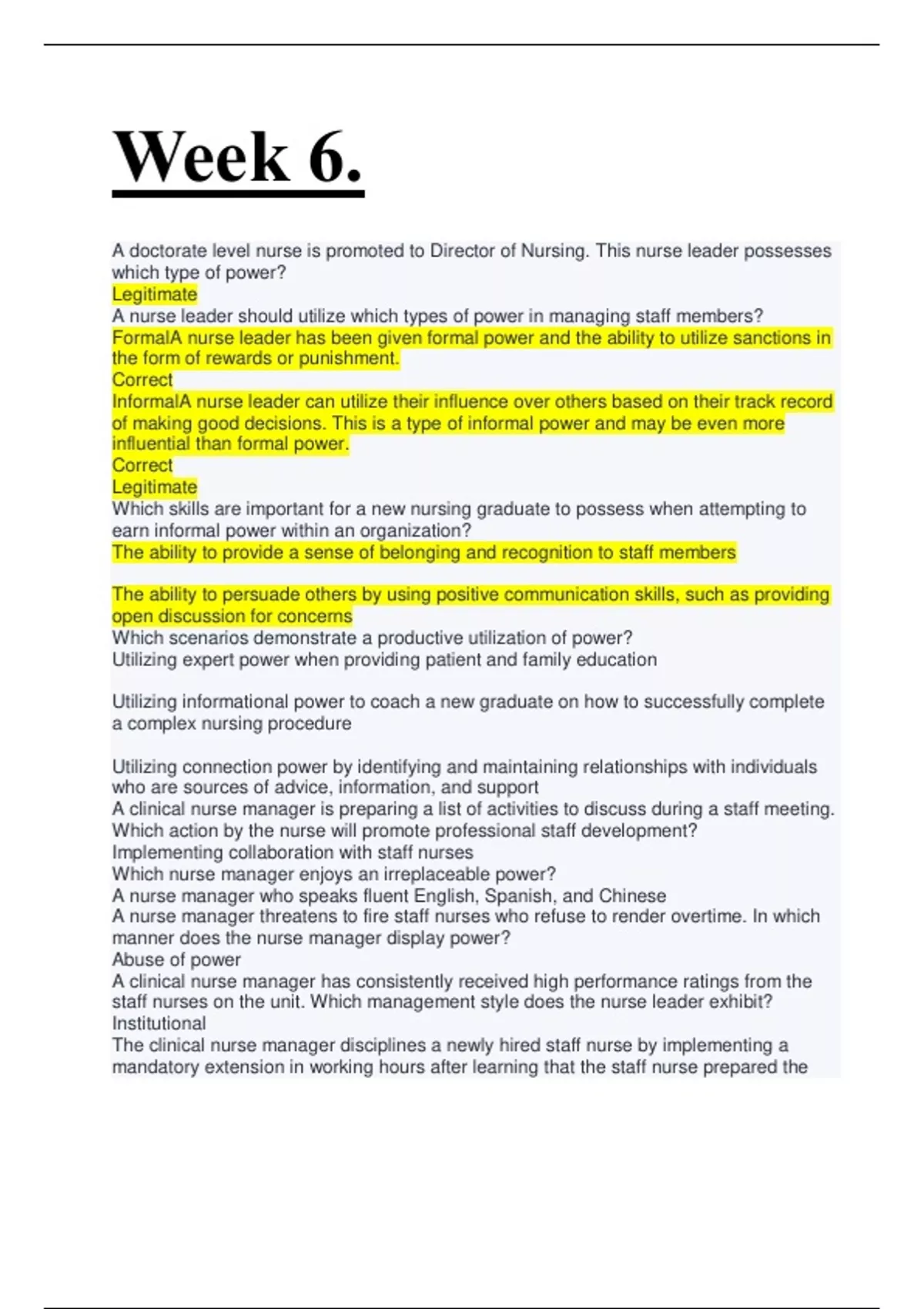 Correct Legitimate Which skills are important for a new nursing graduate to possess when attempting to earn informal power within an organization? The ability to provide a sense of belonging and recognition to staff members The ability to persuade others by using positive communication skills, such as providing open discussion for concerns Which scenarios demonstrate a productive utilization of power? Utilizing expert power when providing patient and family education Utilizing informational power to coach a new graduate on how to successfully complete a complex nursing procedure Utilizing connection power by identifying and maintaining relationships with individuals who are sources of advice, information, and support A clinical nurse manager is preparing a list of activities