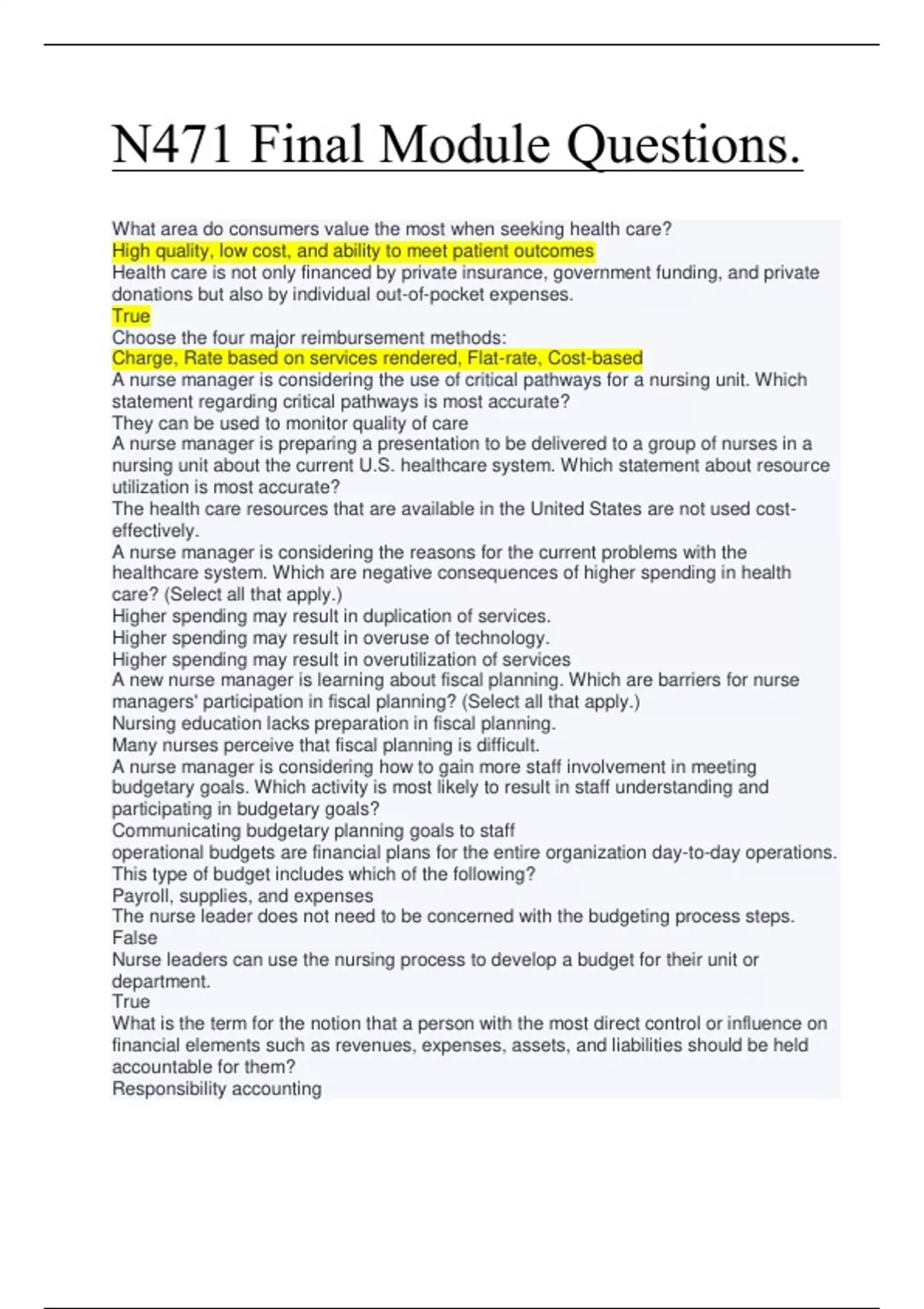 What area do consumers value the most when seeking health care? High quality, low cost, and ability to meet patient outcomes Health care is not only financed by private insurance, government funding, and private donations but also by individual out-of-pocket expenses. True Choose the four major reimbursement methods: Charge, Rate based on services rendered, Flat-rate, Cost-based A nurse manager is considering the use of critical pathways for a nursing unit. Which statement regarding critical pathways is most accurate? They can be used to monitor quality of care A nurse manager is preparing a presentation to be delivered to a group of nurses in a nursing unit about the current U.S. healthcare system. Which statement about resource utilization is most accurate? The health care resources that are available in the United States are not used costeffectively. A nurse manager is considering the reasons for the current problems with the healthcare system. Which are negative consequences of higher spending in health care? (Select all that apply.)