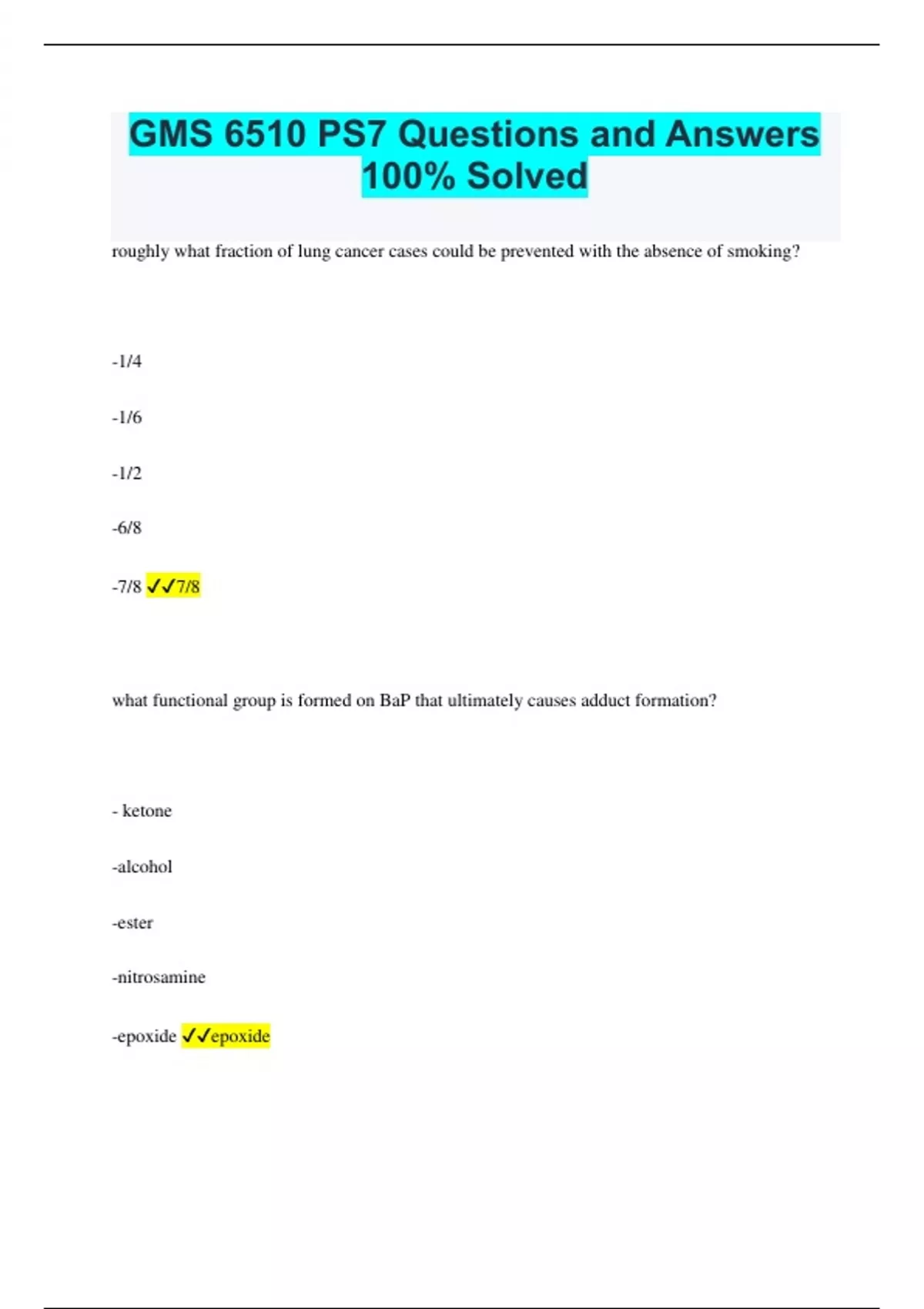 GMS 6510 PS7 Questions and Answers 100% Solved roughly what fraction of lung cancer cases could be prevented with the absence of smoking? -1/4 -1/6 -1/2 -6/8 -7/8 7/8 what functional group is formed on BaP that ultimately causes adduct formation? - ketone -alcohol -ester -nitrosamine -epoxide epoxide what enzyme is responsible for activating PAHs? -CYP2E1 -CYP1A1 -CYP1A2 -GSTM1 -CYP2D6 CYP1A1 in tobacco-associated COPD, is the ability of the body to respond to reactive oxygen species increased or decreased? -increased -decreased decreased in tobacco-associated COPD, is the innate immune system aberrantly activated or depressed? -activated -depressed activated clinically, increased incidence of asthma is seen in