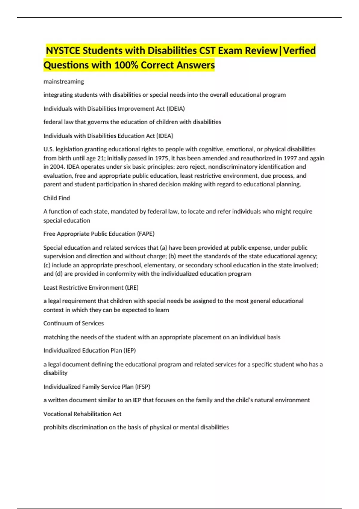 NYSTCE Students with Disabilities CST Exam Review|Verfied Questions with 100% Correct Answers mainstreaming integrating students with disabilities or special needs into the overall educational program Individuals with Disabilities Improvement Act (IDEIA) federal law that governs the education of children with disabilities Individuals with Disabilities Education Act (IDEA) U.S. legislation granting educational rights to people with cognitive, emotional, or physical disabilities from birth until age 21; initially passed in 1975, it has been amended and reauthorized in 1997 and again in 2004. IDEA operates under six basic principles: zero reject, nondiscriminatory identification and evaluation, free and appropriate public education, least restrictive environment, due process, and parent and student participation in shared decision making with regard to educational planning. Child Find A function of each state, mandated by federal law, to locate and refer individuals who might require special education Free Appropriate Public Education (FAPE) Special education and related services that (a) have been provided at public expense, under public supervision and direction and without charge; (b) meet the standards of the state educational agency; (c) include an appropriate preschool, elementary, or secondary school education in the state involved; and (d) are provided in conformity with the individualized education program Least Restrictive Environment (LRE) a legal requirement that children with special needs be assigned to the most general educational context in which they can be expected to learn Continuum of Services matching the needs of the student with an appropriate placement on an individual basis Individualized Education Plan (IEP) a legal document defining the educational program and related services for a specific student who has a disability Individualized Family Service Plan (IFSP) a written document similar to an IEP that focuses on the family and the child's natural environment Vocational Rehabilitation Act prohibits discrimination on the basis of physical or mental disabilities Family Educational Rights and Privacy Act (FERPA) helps ensure the privacy of educational records such as IEPs Every Student Succeeds Act (ESSA) increases the accountability of schools with respect to the academic progress of students with disabilities Committee on Special Education (CSE) stores student special education records, opens all initial referrals and assigns a CSE case number for public school students. The CSE also manages all special education issues for non-public schools (private, parochial) and charter schools Committee on Preschool Special Education (CPSE) for children between the ages of 3 and 5 Procedural Safeguards provisions of IDEA designed to protect students and parents in the special education process Due Process refers to principles that attempt to guarantee the rights of citizens due process hearing A procedure to resolve a conflict between school and family over the evaluation, program, or placement of a student with a disability age of majority the designated age at which an individual is recognized as an adult prereferral assessment to help students who are struggling in the general education setting before referring them for special education assessment Response to Intervention (RTI) an educational strategy intended to help children who demonstrate below-average achievement in early grades, using special intervention self-reflection the process of becoming aware of and analyzing one's own thoughts, feelings, and behaviors What Works Clearinghouse (WWC) __________________ is an example of a US government website that provides information about scientifically based research of relevance to instructional practice. US Department of Education A government agency that oversees education and federal student aid in the United States Office of Special Education and Rehabilitative Services (OSERS) offers programs, services, and a variety of resources that promote inclusion, equity, and opportunity for students with disabilities Council for Exceptional Children An organization that was founded in 1922 to advocate for all children with disabilities is called the receptive language ability to comprehend speech expressive language the ability to use sounds, signs, or symbols to communicate meaning Phonology the study of speech sounds in language phoneme in language, the smallest distinctive sound unit Semantics the set of rules by which we derive meaning from morphemes, words, and sentences in a given language; also, the study of meaning Syntax sentence structure and word order Morphology study of form Pragmatics (use) the rules of language governing how language is used for social purposes orthography the conventional spelling system of a language Concepts of Print Basic understanding about the way print works including the direction of print, spacing, punctuation, letters, and words Alphabetic knowledge The ability to recognize, name, and write letters Alphabetic Principle an understanding that letters and letter patterns represent the sounds of spoken words phonological awareness the ability to reflect on and manipulate the sound structure of spoken language Decoding sounding out words fluency smoothness of speech Pre-alphabetic phase Children can identify words, but they do so by treating words as visual objects, rather than applying letter-sound associations Partial Alphabetic Phase children know some letters and letter-sound associations and can use them along with context clues Full alphabetic phase children apply alphabet knowledge systematically when decoding and often decode words letter by letter consolidated alphabetic phase recurring letter patterns become consolidated. Rather than sounding out words letter by letter, children recognize that certain groups of letters function as units Digraphs pairs of letters that represent a single sound like "sh" and "oo" consonant clusters p