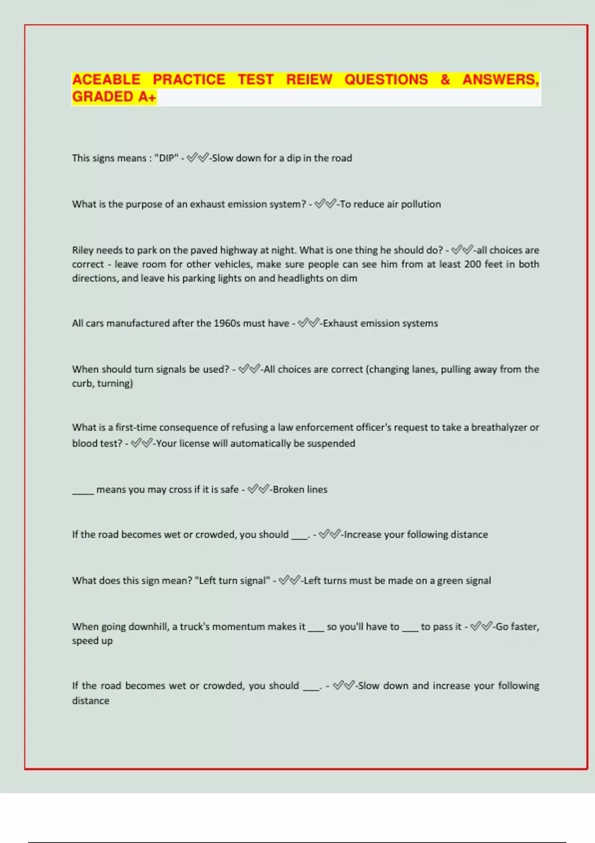 ACEABLE PRACTICE TEST REIEW QUESTIONS & ANSWERS, GRADED A+ This signs means : "DIP" - -Slow down for a dip in the road What is the purpose of an exhaust emission system? - -To reduce air pollution Riley needs to park on the paved highway at night. What is one thing he should do? - -all choices are correct - leave room for other vehicles, make sure people can see him from at least 200 feet in both directions, and leave his parking lights on and headlights on dim All cars manufactured after the 1960s must have - -Exhaust emission systems When should turn signals be used? - -All choices are correct (changing lanes, pulling away from the curb, turning) What is a first-time consequence of refusing a law enforcement officer's request to take a breathalyzer or blood test? - -Your license will automatically be suspende