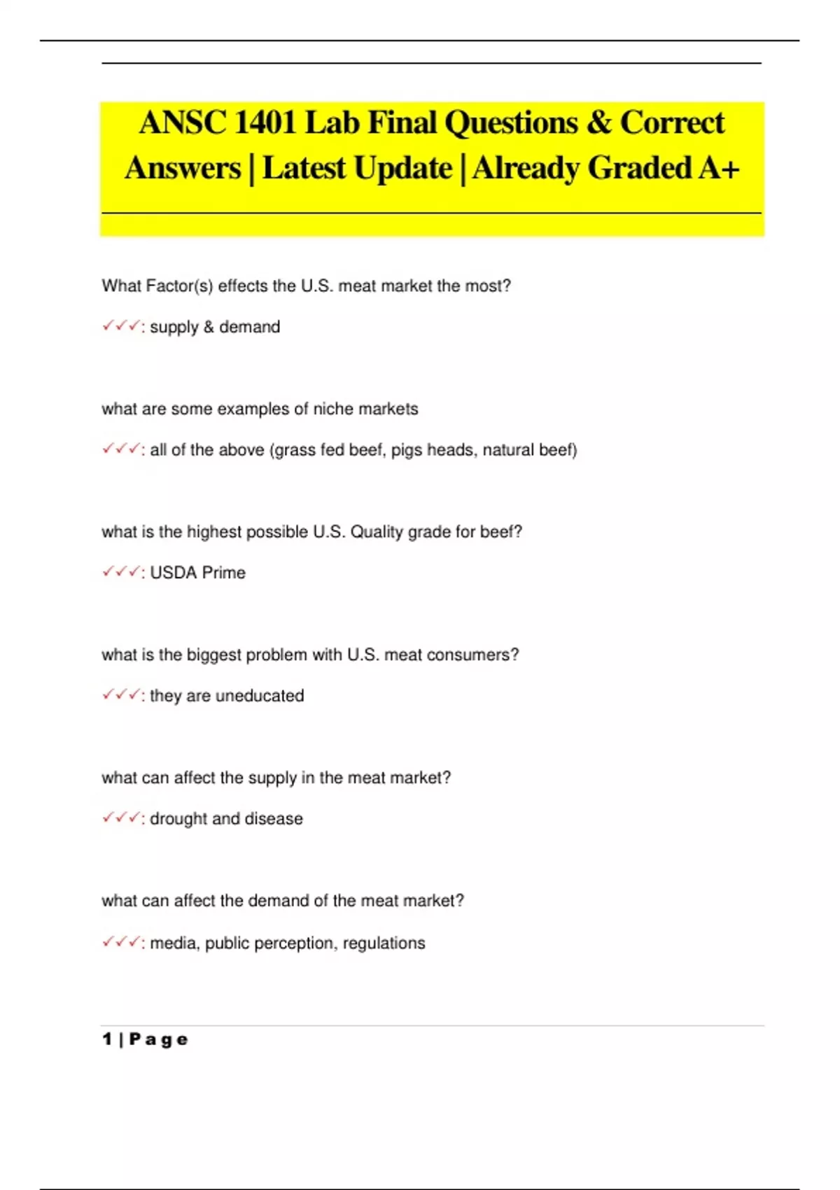 ANSC 1401 Lab Final Questions & Correct Answers | Latest Update |Already Graded A+