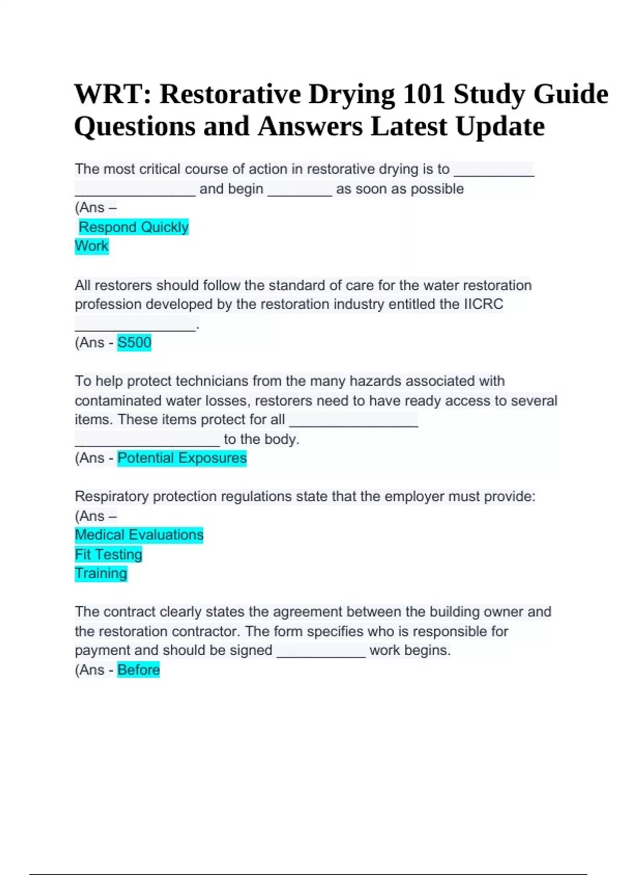 WRT: Restorative Drying 101 Study Guide Questions and Answers Latest Update. The most critical course of action in restorative drying is to __________ _______________ and begin ________ as soon as possible (Ans – Respond Quickly Work All restorers should follow the standard of care for the water restoration profession developed by the restoration industry entitled the IICRC _______________. (Ans - S500 To help protect technicians from the many hazards associated with contaminated water losses, restorers need to have ready access to several items. These items protect for all ________________ __________________ to the body. (Ans - Potential Exposures Respiratory protection regulations state that the employer must provide: (Ans – Medical Evaluations Fit Testing Training The contract clearly states the agreement between the building owner and the restoration contractor. The form specifies who is responsible for payment and should be signed ___________ work begins. (Ans - Before WRT: Restorative Drying 101 Study Guide Questions and Answers Latest Update The technician's first responsibility when arriving at a water damage site is to identify, communicate and eliminate ____________ _________________ if reasonably possible. (Ans - Safety Hazards Federal regulations apply to the handling of ___________ -based paint and asbestos. (Ans – Lead After safety concerns have been addressed and the initial water source has been stopped, the restorer must complete an evaluation of the water's migration through the structure. During this process, the restorer inspects all ____________________ ______________________ areas. (Ans - Potentially Affected The ultimate goal is to find the "edge" of water migration, which moves in a three-dimensional path throughout the structure. This is accomplished across carpeted surfaces using a ________________ _____________, and across most hard surfaces using a __________________________ (non-penetrating) moisture meter. (Ans – Moisture Sensor Non-Invasive Water from a clean source with no substantial risk of causing sickness or discomfort is said to be _____________________ _____ water. (Ans - Category 1 .